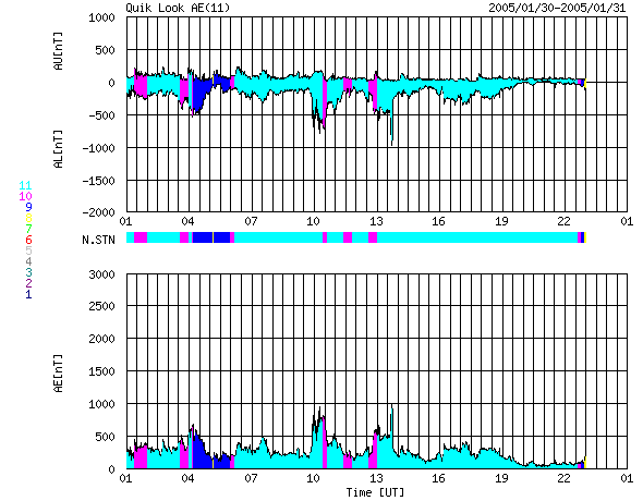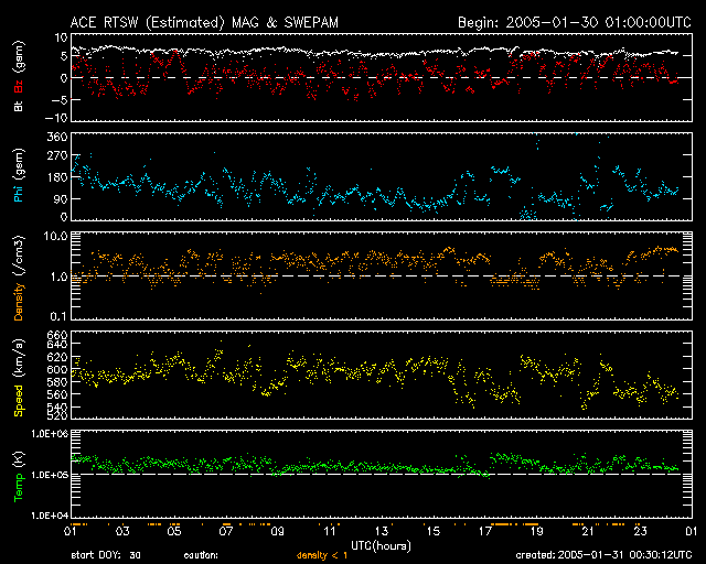 2005/ 1/31 09:30 更新 高速太陽風が続いています(550km/秒)。オーロラもやや活発です。 担当 篠原 コロナホールによる高速太陽風が続いています。 速度は600km/秒からやや下がって550km/秒になっています。 磁場強度は6nT程度と普通の強さですが、南北成分が激しく南北に振動しています。 その影響でしょう、オーロラ活動がやや活発に続いています。 オーロラ活動の目安であるAE指数のグラフを見ると、300nT程度の変化が連続して観測され、 時おり500nTを越えるまとまった活動が発生しています。 27日周期のグラフを参考にすると、 前周期はこれからもう一度速度の高い領域を迎えていました(1月4〜5日)。 今日のSOHO EIT284カメラの太陽画像でも、 太陽面の(西寄り)右寄りに、南北方向(縦方向)に黒い筋として コロナホールが伸びているのが見えています。 ここの影響がこれから地球に及ぶため、今周期ももう2日ほど高速風が続きそうです。 太陽面は小さな黒点群が見えているだけです。 X線のグラフもたいへん低いレベルにまだ下がっています。 フレア(太陽爆発)活動はとても穏やかです。 SOHO衛星のEIT284カメラの映像 (c) SOHO (ESA & NASA)