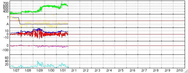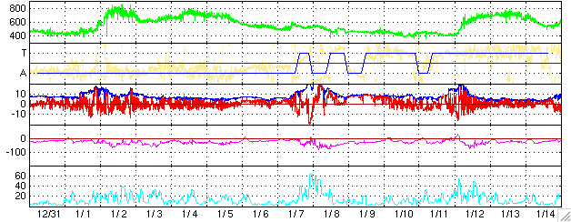 ACEが観測した太陽風の磁場(1番上の枠、白線は全体の強度、赤線は南北成分) および、太陽風の密度(3番目の橙線)、速度(4番目の黄線) (c) NOAA/SEC ![]() リアルタイムAE指数 下段のAEグラフの値が高くなると、オーロラ活動が活発化しています。 (c) 京都大学, NICT ![]() 27日の太陽周期に合わせたデータプロット (太陽風版) 太陽が同じ面を地球に向けていた27日前の変化から、今後を予想することができます。 (c) NICT