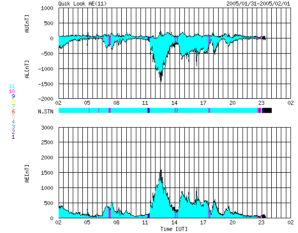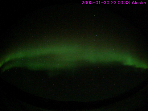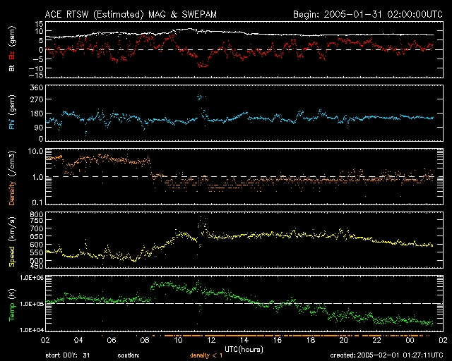 2005/ 2/ 1 10:27 更新 太陽風の速度が再上昇しました。現在は600km/秒。オーロラがとても活発に活動しています。 担当 篠原 昨日お知らせした様に、太陽風の速度が再び上昇し、 31日19時(世界時31日10時)に650km/秒に強まりました。 太陽風の磁場強度も連動して強まり、最大で10nTを越えるほどになりました。 南北成分も大きく変動して、度々-5〜-10nTと強い南向きを示しています。 このため、オーロラ活動も活発で、 AE指数のグラフでは最大で1500nTに達する激しい変動も観測されています。 アラスカで観測された昨夜のオーロラを動画で紹介します。一瞬、ものすごい明るさで輝いています。 現在の太陽風は、速度がやや落ちて600km/秒になっています。 磁場強度もやや下がって8nTになっています。 第二波の高速風も最高値は越えた様ですが、依然速度、磁場強度とも高いレベルです。 今後も南北成分が大きく振れ続けた場合、オーロラも活発に続くでしょう。 高速風はこれから2日程度かけてゆっくり下がって行きます。 下がりきるまでは、磁気圏も活動的な状態が続きそうです。 放射線帯の高エネルギー電子が密度を増やしつつあります。 まだ警戒ライン(10の4乗の線)には達していませんが、明日、明後日以降注意が必要となりそうです。 太陽のフレア活動は概ね穏やかです。 アラスカのライブカメラで撮影された、31日17時(世界時31日8時)のオーロラ活動。 (c) NICT/SALMON ![]() SOHO衛星のEIT284カメラの映像 (c) SOHO (ESA & NASA)
