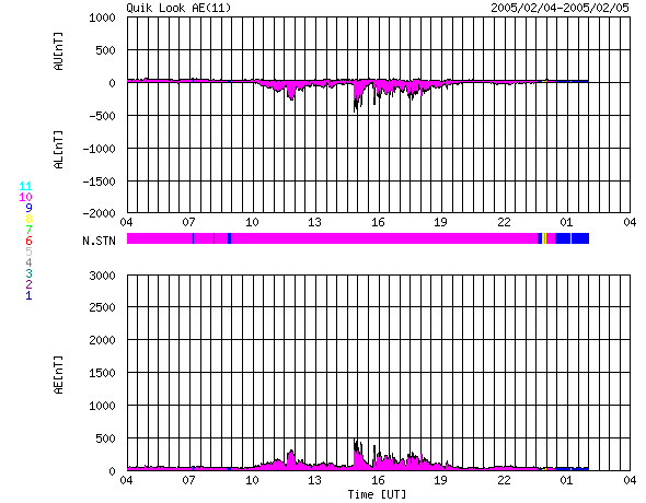 SOHO衛星のMDIカメラによる太陽黒点 (c) SOHO (ESA & NASA) ![]() GOES衛星の太陽X線データ (c) NOAA/SEC ![]() ACEが観測した太陽風の磁場(1番上の枠、白線は全体の強度、赤線は南北成分) および、太陽風の密度(3番目の橙線)、速度(4番目の黄線) (c) NOAA/SEC ![]() リアルタイムAE指数 下段のAEグラフの値が高くなると、オーロラ活動が活発化しています。 (c) 京都大学, NICT ![]() | ||||||||||||||||||||||||||||||||||||||||