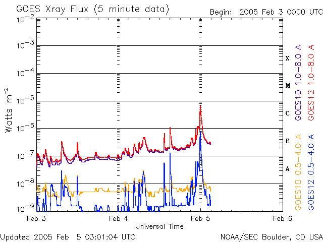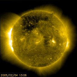 2005/ 2/ 5 12:03 更新 720黒点群が帰って来つつあります。フレア活動が見られました。太陽風、磁気圏は静穏です。 担当 篠原 1月中旬に激しいフレア活動を続けた720黒点群が、再び地球側に戻りつつあります。 (黒点の写真にはまだ見えていません) SOHO EIT284カメラの東端(左端)が明るくなっていますが、この活動的な領域が720黒点群です。 黒点群が一周してこちら側に戻って来た場合は、新しい番号が与えられます。 今度は何番になるのでしょうか。 挨拶代わりのC7の小規模フレアを、5日9時(世界時5日0時)に起こしています。 現在この黒点群がどの程度の活動度なのか、今後に注目です。 500km/秒とやや高速状態が続いていた太陽風ですが、 緩やかに速度が低下して現在は400km/秒と通常レベルになっています。 磁場強度も4nTにやや弱まっています。 このため、オーロラ活動もかなり穏やかになっています。 オーロラの活動度を示すAE指数では500nT弱の小さな変化がありましたが、 ほとんどの時間帯で静穏です。 これから2〜3日程度、太陽風と磁気圏は穏やかな状態が続くでしょう。 SOHO衛星のEIT284カメラの映像 (c) SOHO (ESA & NASA)