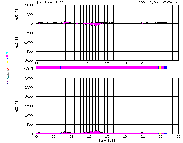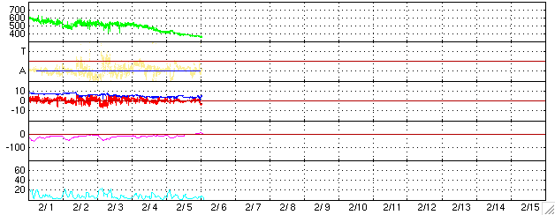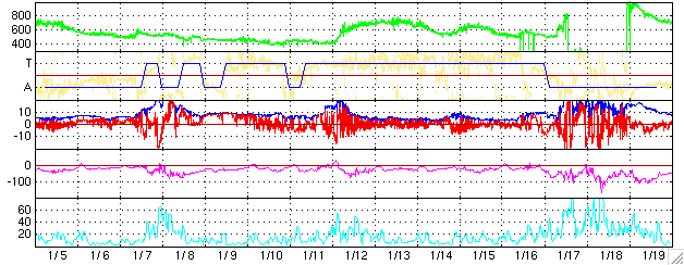 ACEが観測した太陽風の磁場(1番上の枠、白線は全体の強度、赤線は南北成分) および、太陽風の密度(3番目の橙線)、速度(4番目の黄線) (c) NOAA/SEC ![]() リアルタイムAE指数 下段のAEグラフの値が高くなると、オーロラ活動が活発化しています。 (c) 京都大学, NICT ![]() 27日の太陽周期に合わせたデータプロット (太陽風版) 太陽が同じ面を地球に向けていた27日前の変化から、今後を予想することができます。 (c) NICT