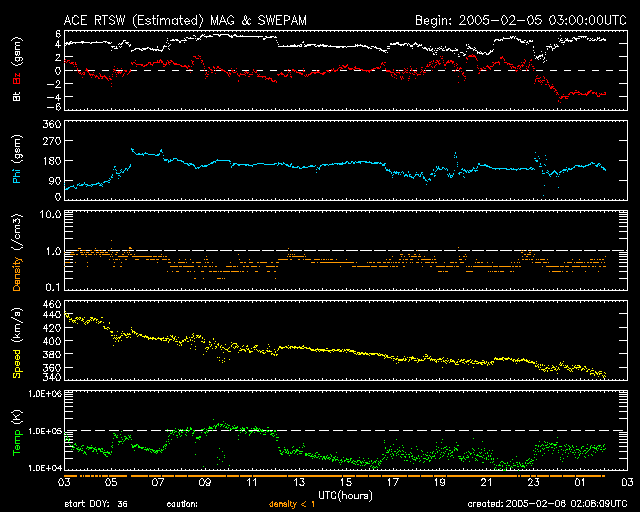 2005/ 2/ 6 11:06 更新 太陽風の速度が遅く、磁気圏は穏やかです。明後日頃から高速風が来るでしょう。 担当 篠原 太陽風の速度は一段と低下して、360km/秒まで下がっています。 オーロラ活動も非常に穏やかで、AE指数ではほとんど変化が見られません。 この静かな状態は明日いっぱい続きそうです。 SOHO EIT284カメラの太陽画像をご覧下さい。 太陽面の上部にコロナホールと呼ばれる、暗い穴の様な領域が見えます。 ここは、太陽の磁場が宇宙空間に広がっている部分で、 ここから高速の太陽風が吹き出しています。 この風が明後日頃から地球に当たる様になりそうです。 27日周期の図を参考にすると、 このコロナホールは前周期は1月12日から地球に影響を及ぼしていました。 速度の上昇(最大700km/秒でした)と磁場強度の強まりが発生し、 オーロラ活動が活発になりました。 同様の変化が明後日の8日頃から始まるでしょう。 太陽のフレア活動は、現在は穏やかです。 先月激しい活動を起こした720黒点群は、まだこちら側には来ていません。 しかし、GOES衛星のX線画像を見ると、 太陽の縁の向こう側で活発に活動している様子が既に見えています。 この活動は、X線のグラフでもCクラスに届かない規模の変化として観測されています。 明日以降、本格的にこの黒点群が地球から見える様になるでしょう。 今周期はどの程度の活動が見られるのか注目です。 SOHO衛星のEIT284カメラの映像 (c) SOHO (ESA & NASA)