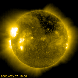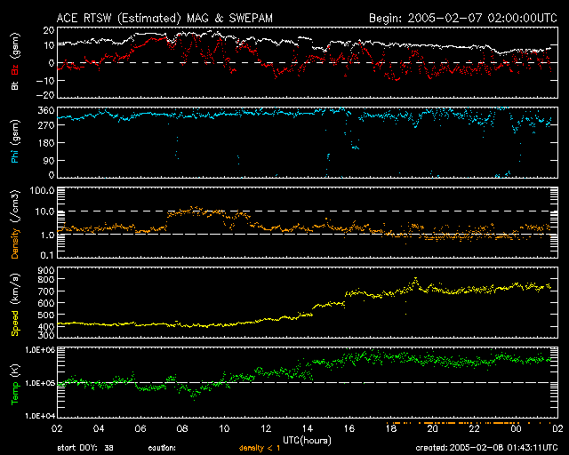 2005/ 2/ 8 10:44 更新 太陽風の速度がたいへん高速になっています(750km/秒)。オーロラ活動も活発です。 担当 篠原 コロナホールによる高速太陽風領域に地球が入っています。 7日21時(世界時7日12時)頃から太陽風の速度が上昇を始め、 8日4時(世界時7日19時)に750km/秒に達しました。 現在もとても高速な状態が続いています。 速度よりも先に15nTまで上昇していた太陽風の磁場強度ですが、 速度が上がりきった頃から低下を始め、現在は8nTくらいまで下がっています。 このことから、太陽風の速度の上昇は一段落ついた様です。 太陽風磁場の南北成分(ACEデータ赤線)を見ると、比較的頻繁に南北に変化しています。 磁場強度が強まっているため、南を向いた時には-10nT近い強い変化が起こっています。 速度が高まっている事と相まって、オーロラ活動を活発にしています。 オーロラの活動度を示すAE指数のグラフでは、 1000nTを越える様な強い活動が数度にわたって観測されています。 現在も500nT規模の変化が続いており、オーロラは活発に続いている様です。 高速太陽風はこれから3〜4日程度続くでしょう。 非常に速度が高いので、太陽風磁場の南向きが見られるとオーロラも活発になりそうです。 太陽面では、732黒点群(旧720黒点群)の姿がはっきり見えて来ました。 もう、すっかり弱まっています。 今周期に大きな問題を起こす事はないでしょう。 一方、732黒点群の左下、太陽の東縁(左縁)に別の黒点群が見えています。 番号がまだ書かれていませんが、733黒点群です。 現在、こちらの黒点群が活発に活動していて、Cクラスの小規模フレアを数回起こしています。 今後の活動に注目です。 SOHO衛星のEIT284カメラの映像 (c) SOHO (ESA & NASA)