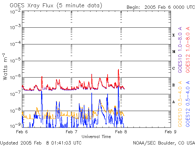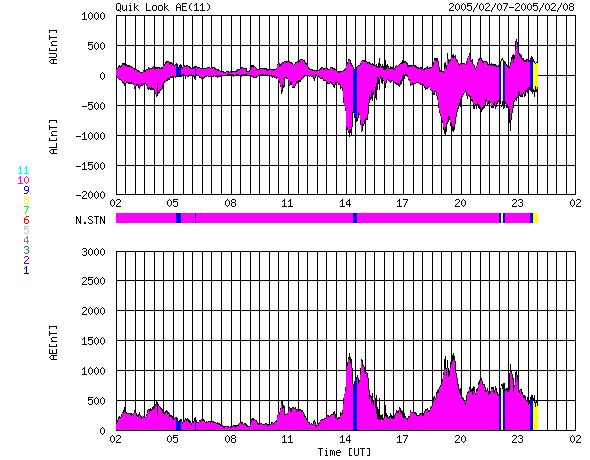 ACEが観測した太陽風の磁場(1番上の枠、白線は全体の強度、赤線は南北成分) および、太陽風の密度(3番目の橙線)、速度(4番目の黄線) (c) NOAA/SEC ![]() リアルタイムAE指数 下段のAEグラフの値が高くなると、オーロラ活動が活発化しています。 (c) 京都大学, NICT ![]() SOHO衛星のMDIカメラによる太陽黒点 (c) SOHO (ESA & NASA) ![]() GOES衛星の太陽X線データ (c) NOAA/SEC ![]() | ||||||||||||||||||||||||||||||||||||||||