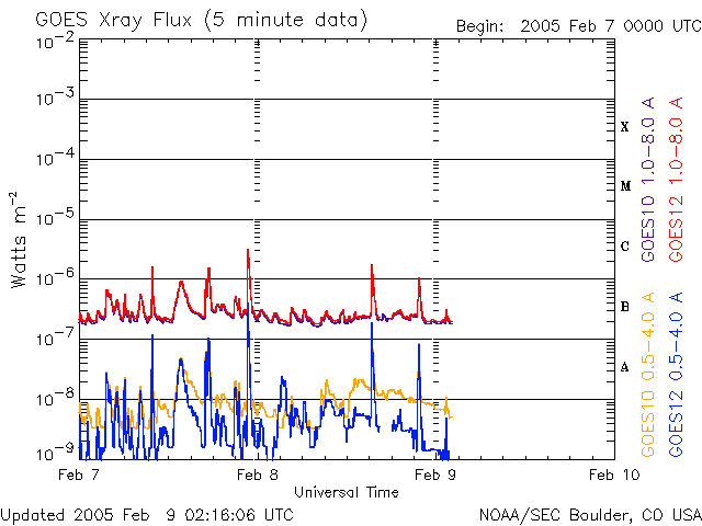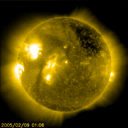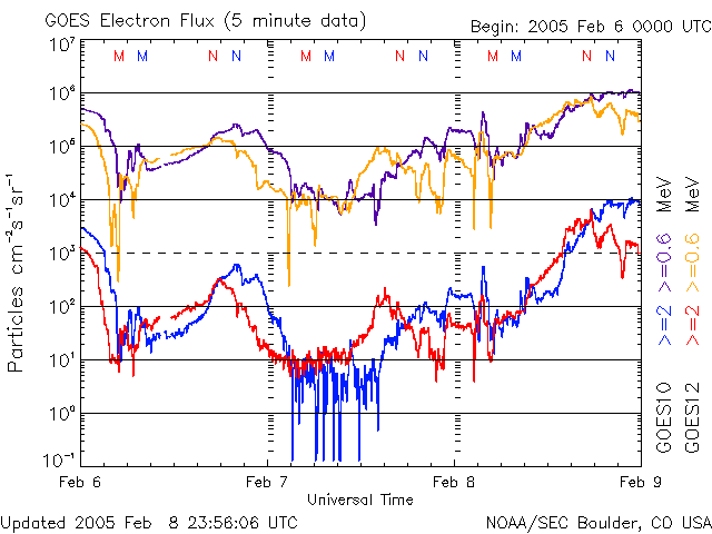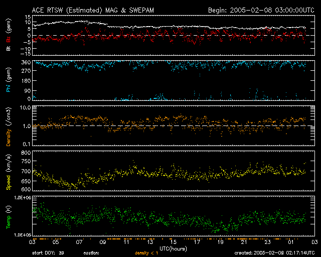 2005/ 2/ 9 11:18 更新 高速の太陽風が続いています(700km/秒)。オーロラ活動も活発です。放射線帯の高エネルギー電子が増加しつつあります。 担当 篠原 コロナホールによる高速の太陽風が続いています。 ACE衛星の観測によると、太陽風の速度は昨日からほとんど変化がなく、 700km/秒前後ととても高速な状態です。 磁場強度は5nTと普通のレベルです。 しかし、南北成分を見ると(ACEデータの赤線)、 南北に(マイナス、プラスに)激しく変化している様子が見えます。 この影響でオーロラがとても活発に活動しています。 AE指数のグラフを見ると、1000nT規模の大きな現象が幾度も発生しています。 磁場の南北変動が現在も続いていることと、速度がとても速い事から、 今後もオーロラ活動は活発に続きそうです。 今は天気が悪い様ですが、アラスカのオーロラライブでオーロラが楽しめるかもしれません。 高速太陽風は、もう2〜3日程度続くと予想されます。 高速風の影響で、放射線帯の高エネルギー電子が増加しています。 そろそろ警戒ライン(10の4乗の線)を越えようかというレベルです。 明日以降、更に増加している可能性がありますので、衛星の運用では注意が必要になりそうです。 太陽では、小規模なフレア活動が見られています。 732、733黒点群が起こしていますが、今の所これ以上の活動を起こす事は無さそうです。 SOHO衛星のEIT284カメラの映像 (c) SOHO (ESA & NASA)