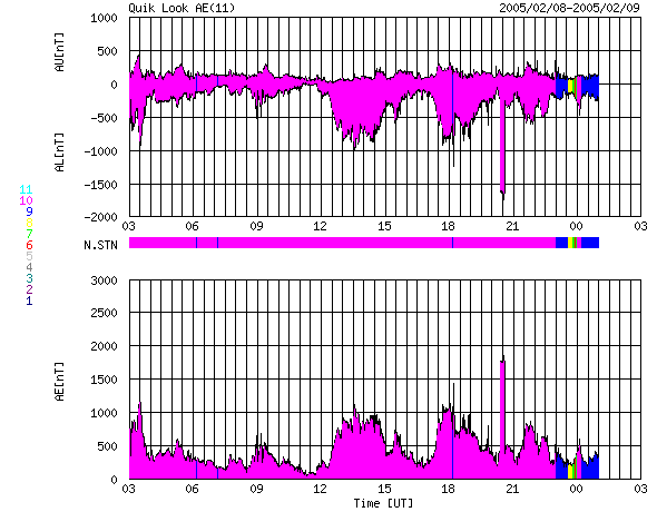 ACEが観測した太陽風の磁場(1番上の枠、白線は全体の強度、赤線は南北成分) および、太陽風の密度(3番目の橙線)、速度(4番目の黄線) (c) NOAA/SEC ![]() リアルタイムAE指数 下段のAEグラフの値が高くなると、オーロラ活動が活発化しています。 (c) 京都大学, NICT ![]() GOES衛星による、静止衛星軌道における高エネルギー電子の変化 (c) NOAA/SEC ![]() GOES衛星の太陽X線データ (c) NOAA/SEC ![]() SOHO衛星のMDIカメラによる太陽黒点 (c) SOHO (ESA & NASA) ![]() | ||||||||||||||||||||||||||||||||||||||||