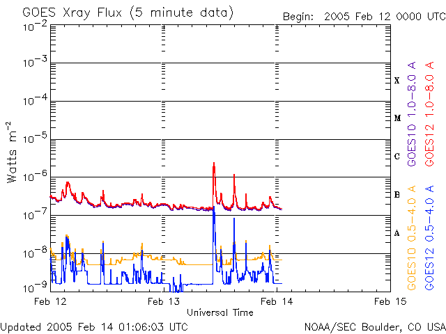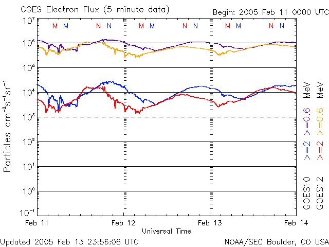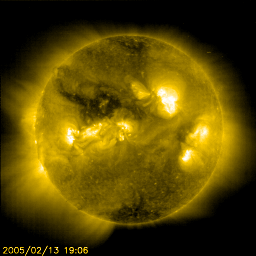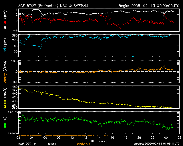 2005/ 2/14 10:10 更新 太陽風が穏やかになり、オーロラ活動はとても静かです。小規模ですがフレア活動が見えています。 担当 篠原 太陽風の速度は更に低下して、360km/秒に下がりました。 通常レベルと比較して、やや遅めという速度です。 磁場強度は3nTと弱い状態ですので、南向き成分も大きな値にはなりません。 このため、オーロラ活動はとても穏やかです。 AE指数のグラフを見ると、ほんの小さな変化が見えている程度です。 過去の太陽風の変化から、セクター境界(太陽風磁場の方向が大きく切り替わる境界)が そろそろ見られるのではと予想していましたが、まだその変化は見えていません。 今日辺りには発生するのではないかと思われるのですが、どうなるでしょうか。 その変化に前後して、太陽風磁場に乱れが発生するかもしれません。 SOHO EIT284カメラの太陽画像には、新たなコロナホールが見えています。 太陽面の中央やや上寄りに左に向かって黒い領域が見えています。 ここから速度の高い太陽風が吹き出していて、3〜4日後くらいから地球に当たる様になるでしょう。 オーロラ活動などが活発になる可能性があります。 放射線帯の高エネルギー電子は再び密度を増しています。 GOES 10,12の両衛星で警戒ラインを越えるレベルに戻ってしまいました。 やはり減衰するには時間がかかります。 太陽面では733,734,735の黒点群が小規模な活動ですが、やや動きを見せています。 Cクラスの小規模なフレアを2回起こし、X線の動画を見ていると、少し元気になっている様に見えます。 規模が小さいため現時点では小さな活動に留まるでしょうが、今後の変化に注意したいと思います。 SOHO衛星のEIT284カメラの映像 (c) SOHO (ESA & NASA)