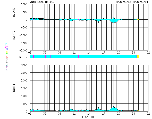 ACEが観測した太陽風の磁場(1番上の枠、白線は全体の強度、赤線は南北成分) および、太陽風の密度(3番目の橙線)、速度(4番目の黄線) (c) NOAA/SEC ![]() リアルタイムAE指数 下段のAEグラフの値が高くなると、オーロラ活動が活発化しています。 (c) 京都大学, NICT ![]() GOES衛星による、静止衛星軌道における高エネルギー電子の変化 (c) NOAA/SEC ![]() SOHO衛星のMDIカメラによる太陽黒点 (c) SOHO (ESA & NASA) ![]() GOES衛星の太陽X線データ (c) NOAA/SEC ![]() | ||||||||||||||||||||||||||||||||||||||||