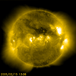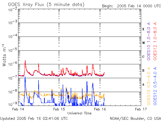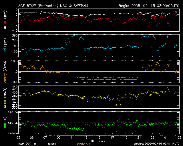2005/ 2/16 11:41 更新 磁気圏は静穏です。太陽風にやや乱れが見られています。これからコロナホールの影響が始まります。 担当 篠原 太陽風の速度、磁場強度はほぼ通常のレベルです。 速度は400km/秒で安定し、磁場強度は6nT前後です。 太陽風磁場の南向き成分もほとんど無かったため、磁気圏も静穏で、 オーロラ活動を示すAE指数のグラフにはほとんど変化が見られませんでした。 しかし、太陽風データの最新の部分を見ると、やや乱れが見られています。 特に、磁場成分に見られていて、磁場強度はあまり変わっていませんが、 南北成分(赤線)が大きく振動しています。 速度も小幅ですが上昇している様に見えます。 SOHO EIT284の太陽画像の中心に黒く見ているコロナホールの影響が、 明日、明後日頃から地球に及ぶと予想されています。 その兆しが始まっているのかもしれません。 太陽風磁場の方向を調べると、新たなセクター境界を越えつつもある様で、 それと関係した太陽風の乱れも起こっているのでしょう。 コロナホールの規模や、先々月の変化から考えて、大きな乱れが発生する事はないでしょう。 一時的に活発なオーロラが見られたりする程度と思われます。 733,734,735と3つ並んだ黒点群は、規模としては目立った変化は起きていません。 X線動画で見ると、小さなフレア活動を頻繁に起こしていて、 きらきら奇麗に見えます。 大きな活動になることはなく、穏やかな状態が続くでしょう。 SOHO衛星のEIT284カメラの映像 (c) SOHO (ESA & NASA)