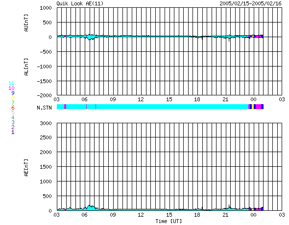 ACEが観測した太陽風の磁場(1番上の枠、白線は全体の強度、赤線は南北成分) および、太陽風の密度(3番目の橙線)、速度(4番目の黄線) (c) NOAA/SEC ![]() リアルタイムAE指数 下段のAEグラフの値が高くなると、オーロラ活動が活発化しています。 (c) 京都大学, NICT ![]() SOHO衛星のMDIカメラによる太陽黒点 (c) SOHO (ESA & NASA) ![]() GOES衛星の太陽X線データ (c) NOAA/SEC ![]() | ||||||||||||||||||||||||||||||||||||||||