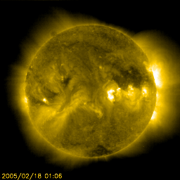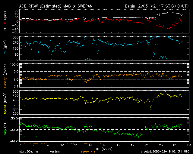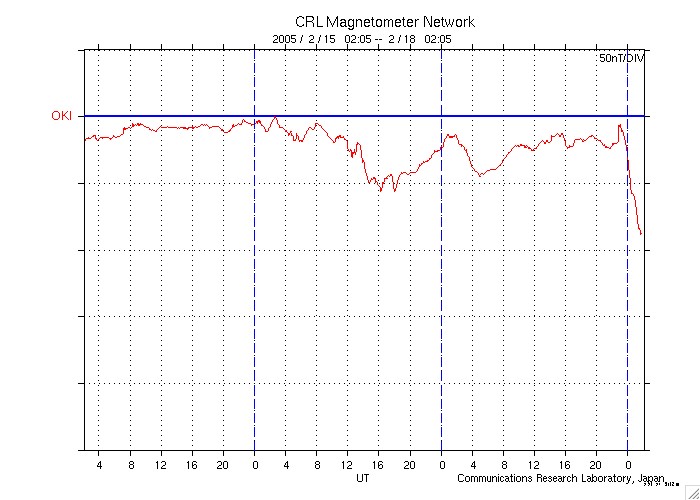 2005/ 2/18 11:14 更新 コロナホールの影響で太陽風が乱れています。磁気嵐状態になっている様です。 担当 篠原 18日7時(世界時17日22時)頃から、太陽風に乱れが発生しています。 磁場強度が急激に強まって、20nTを越えるほどになりました。 しかも、非常に強く南を向いていて、-20nTに達する大きな変化を示しています。 速度には大きな変化はなく、400km/秒から450km/秒にやや強まった程度です。 激しい南向き磁場の影響で磁気圏にエネルギーが流れ込み、磁気嵐状態になっています。 沖縄の磁場変化を見ると、静穏レベル(青の横線)から一気に-80nTも変化しています。 このグラフは、磁場強度が下がるほど磁気嵐が発達している事を示しています。 オーロラ活動を示すAE指数のグラフでは、最新の部分で1000nTに達する変化を観測しています。 ACE衛星のデータを見ると、太陽風磁場は現在も15nT程度の強さを保っていますが、 オーロラ活動に重要な南北成分は、南向きから北向きに反転しつつあるようです。 このまま北を向くと、磁気圏の乱れはここまでで収まるでしょう。 再び、南向きに転じると、更に大きな擾乱に発達する可能性があります。 しばらく太陽風の変化に注目してください。 速度には大きな変化は発生していませんが、コロナホールの規模から考えて、 今後2日程度注意が必要でしょう。 太陽面では735黒点群が現在も大きな姿を見せています。 昨日から規模は保っており、引き続き中規模フレアへの注意が必要でしょう。 SOHO衛星のEIT284カメラの映像 (c) SOHO (ESA & NASA)