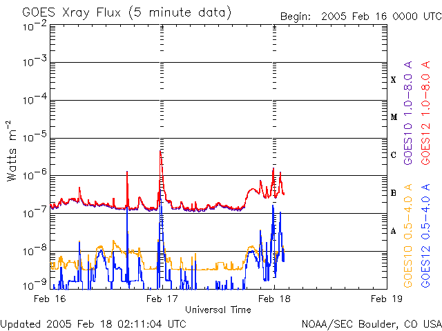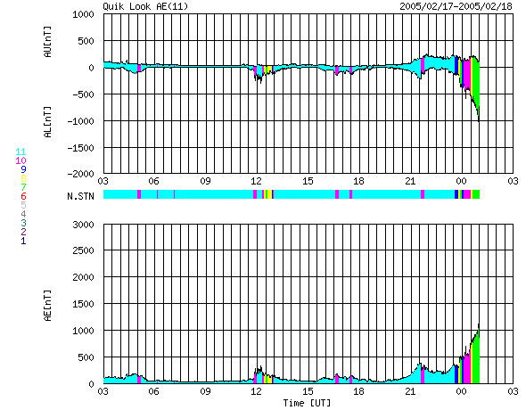 ACEが観測した太陽風の磁場(1番上の枠、白線は全体の強度、赤線は南北成分) および、太陽風の密度(3番目の橙線)、速度(4番目の黄線) (c) NOAA/SEC ![]() 沖縄の磁場擾乱 下へ下がるほど、擾乱が発達している事を意味します。 (c) NICT ![]() リアルタイムAE指数 下段のAEグラフの値が高くなると、オーロラ活動が活発化しています。 (c) 京都大学, NICT ![]() SOHO衛星のMDIカメラによる太陽黒点 (c) SOHO (ESA & NASA) ![]() GOES衛星の太陽X線データ (c) NOAA/SEC ![]() | ||||||||||||||||||||||||||||||||||||||||