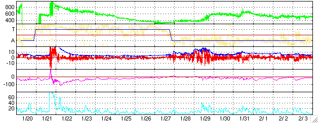 ACEが観測した太陽風の磁場(1番上の枠、白線は全体の強度、赤線は南北成分) および、太陽風の密度(3番目の橙線)、速度(4番目の黄線) (c) NOAA/SEC ![]() リアルタイムAE指数 下段のAEグラフの値が高くなると、オーロラ活動が活発化しています。 (c) 京都大学, NICT ![]() 27日の太陽周期に合わせたデータプロット (太陽風版) 太陽が同じ面を地球に向けていた27日前の変化から、今後を予想することができます。 (c) NICT