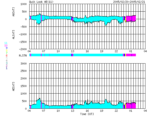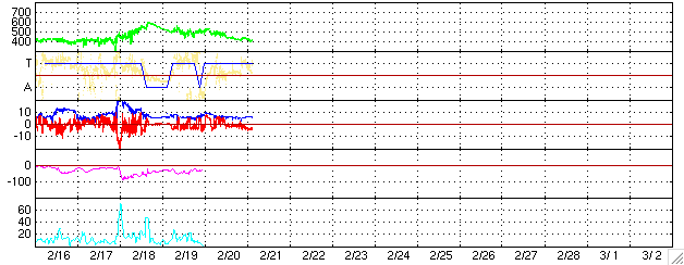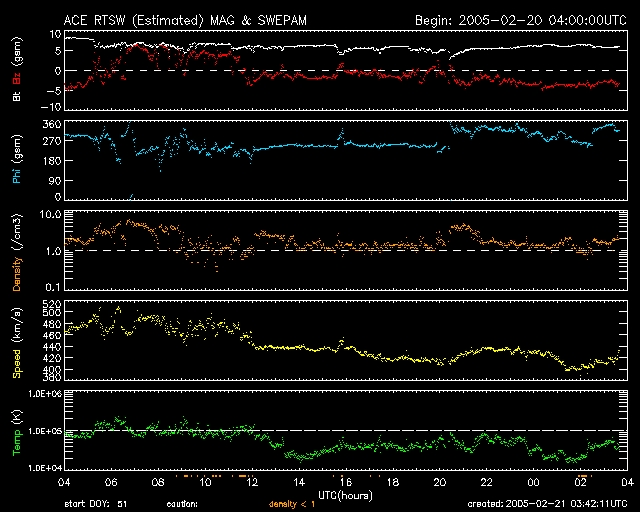 2005/ 2/21 12:41 更新 太陽風の速度は下がりましたが、太陽風の磁場が南を向き続けています。オーロラ活動に影響を与えています。 担当 篠原 ACE衛星の観測によると、太陽風の速度は通常レベルの400km/秒に下がっています。 その一方、太陽風の磁場が特徴的な変化を示しています。 磁場強度は5nTと普通のレベルなのですが、 21日6時(世界時20日21時)頃から現在まで、7時間ほど-3〜-4nTの南を向いた状態が安定して続いています。 その前も小さいながらも南寄りの傾向があり、かなり長時間南向きの状態が続いている事になります。 太陽風の速度が遅いため大きな乱れには至っていませんが、 太陽風から磁気圏にエネルギーが効率よく流れ込んでいると思われます。 AE指数のグラフを見ると、グラフにずれが生じている様に思われます。 (世界時の20日10時付近を見ると、不自然に200nTほどプラス側にずれた状態が見えています) この影響を差し引いても300nT程度の弱いオーロラ活動が続いている様です。 現在の南寄り太陽風磁場の傾向が続く間は、同様の状態が続くでしょう。 SOHO EIT284カメラの太陽画像を見ると、 太陽面の東側(左側)にコロナホール(黒く見えている領域)がとても不規則に広がっています。 27日前の前周期の画像と比べると、太陽の中心付近に達している先頭部分がより濃く見えています。 一方、それに続く南側(下側)のコロナホールは小さくなっているようです。 27日前のデータを見ると、この3日後(1月28日)頃から太陽風の乱れが発生していました。 今周期ではそれは2月24日に相当しますが、コロナホールの様子を見ると、 もう1日ほど早まりそうな印象です。 前周期の実績では、太陽風の速度は600km/秒まで上がりました。 今周期はどうなるでしょうか。 コロナホールの広がりから考えて、乱れは5日程度は続きそうです。 太陽面は穏やかです。735黒点群達もやがて西に没していきます。 その後は黒点が全く見えず、このまま無黒点状態になるかもしれません。 SOHO衛星のEIT284カメラの映像 (c) SOHO (ESA & NASA)
