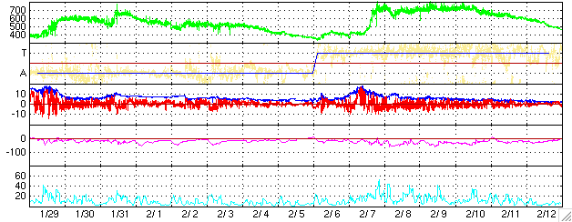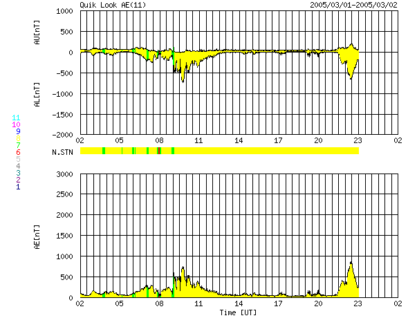 ACEが観測した太陽風の磁場(1番上の枠、白線は全体の強度、赤線は南北成分) および、太陽風の密度(3番目の橙線)、速度(4番目の黄線) (c) NOAA/SEC ![]() リアルタイムAE指数 下段のAEグラフの値が高くなると、オーロラ活動が活発化しています。 (c) 京都大学, NICT ![]() 27日の太陽周期に合わせたデータプロット (太陽風版) 太陽が同じ面を地球に向けていた27日前の変化から、今後を予想することができます。 (c) NICT