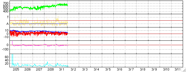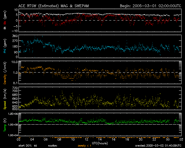 2005/ 3/ 2 10:43 更新 コロナホールの影響が続いています。太陽風速度は620km/秒で、オーロラもやや活発です。 担当 篠原 コロナホールによる高速の太陽風が続いています。 太陽面における、太陽風の吹き出し口の場所が変化しているらしく、 前周期と比べると速度変化の様子が変わっています。 前周期(1月29日〜2月4日)では、期間の前半により高速な太陽風が来ていましたが、 今周期(2月25日〜)はむしろ後半の方が速く、最も高速の部分が3月1日にまで遅くなっています。 この様子では、もう2〜3日程度高速風が続きそうです。 太陽風磁場は強度は5nTのままです。 ほんのわずかですが、次第に弱まる傾向が見られています。 南北成分を見ると(ACEデータの赤線)、南を向く(マイナスを向く)変化が度々現れています。 この時に、オーロラ活動が活発になっています。 AE指数のグラフでは、500〜1000nT規模の活動が2度ほど観測されています。 今後も同程度のオーロラ活動が見られると思われます。 太陽風の速度が下がると活動レベルも下がり、穏やかになっていくでしょう。 SOHO EIT284カメラの太陽画像で、次のコロナホールの姿が見えて来ました。 写真の左上に、黒く丸い穴が開いている様にコロナホールが見えています。 ここから吹き出している高速の太陽風が、今後地球へ影響を及ぼすと予想されます。 前周期の変化を参考にすると、3月6日(図は世界時)の夜くらいに影響が始まりそうです。 太陽面では黒点がほとんど見えない状態が続いています。 掲載している写真では見えませんが、739黒点群が中心付近にあるそうです。 活動的な領域がほとんど無いため、フレア活動は非常に穏やかです。 SOHO衛星のEIT284カメラの映像 (c) SOHO (ESA & NASA)