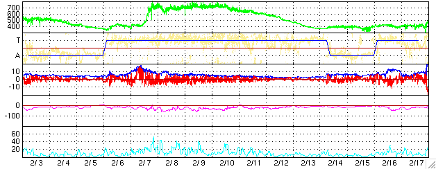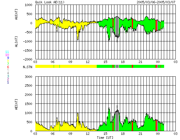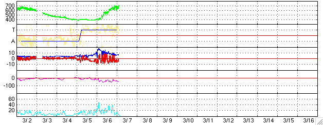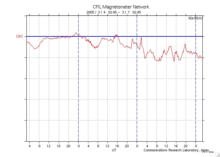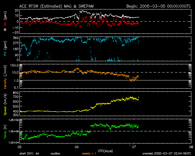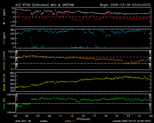 2005/ 3/ 7 11:49 更新 太陽風が高速になっています(600〜700km/秒)。オーロラもとても活発に活動しています。 担当 篠原 6日からコロナホールの影響で、太陽風の速度が上昇を始めました。 ACE衛星のグラフをご覧下さい。 6日12時(世界時6日3時)まで太陽風は速度400km/秒と通常レベルでしたが、 その後緩やかに上昇を始めました。 7日0時(世界時6日15時)頃に600km/秒を越え、 その後600〜700km/秒と高速状態が続いています。 太陽風の磁場も乱れています。 速度の上昇の前に、磁場強度は20nT近くにまで強まりました。 今日1枚めに掲載している3日間の太陽風データをご覧下さい。 4列めの速度グラフ(黄色線)が上昇する前に、1列めの磁場強度(白線)が増加している様子が分かります。 太陽風磁場の南北成分の変動も大きくなり(1列めの赤線が振れている)、 南向きの磁場が太陽風に強く現れていました。 このため、速度が高くなった事と組み合わさって、オーロラ活動がとても活発になっています。 AE指数の図をご覧下さい。 1000nTに達する活発なオーロラが頻繁に発生しています。 沖縄の磁場変動を見ると、静穏レベル(青の横線)から50nT程度減少しています。 小規模ですが、磁気嵐的な状態も発生している様です。 27日周期の図より、前周期の変化を参考にすると、 高速太陽風はこれから4日程度、3月11日いっぱい続きそうです。 明日の8日に速度がもう一段上昇する可能性もあります。 磁場強度は現在も8nT程度ありやや強い状態です。 南向き成分も続いています。 太陽風が高速で、南向きの磁場が頻繁に現れる状態が続いている間はオーロラ活動も続きます。 これから3〜4日程度この様な状態が続きそうです。 太陽面は現在も黒点がほとんど無く、フレア活動はとても静穏です。 ACE衛星が観測した、過去3日間の太陽風の変化。1列めの白線が磁場強度、4列めの黄色線が速度。横軸の数字は日付になります。 (c) NOAA/SEC ![]() ACEが観測した太陽風の磁場(1番上の枠、白線は全体の強度、赤線は南北成分) および、太陽風の密度(3番目の橙線)、速度(4番目の黄線) (c) NOAA/SEC ![]() リアルタイムAE指数 下段のAEグラフの値が高くなると、オーロラ活動が活発化しています。 (c) 京都大学, NICT ![]() 沖縄の磁場擾乱 下へ下がるほど、擾乱が発達している事を意味します。 (c) NICT ![]() 27日の太陽周期に合わせたデータプロット (太陽風版) 太陽が同じ面を地球に向けていた27日前の変化から、今後を予想することができます。 (c) NICT
