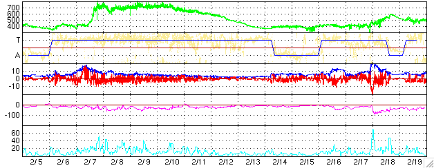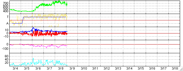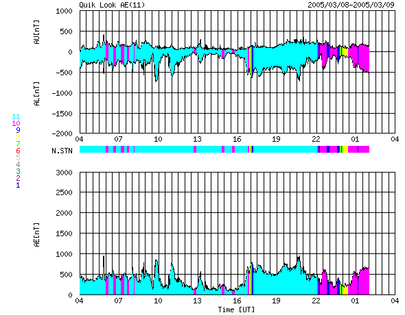 ACEが観測した太陽風の磁場(1番上の枠、白線は全体の強度、赤線は南北成分) および、太陽風の密度(3番目の橙線)、速度(4番目の黄線) (c) NOAA/SEC ![]() リアルタイムAE指数 下段のAEグラフの値が高くなると、オーロラ活動が活発化しています。 (c) 京都大学, NICT ![]() 27日の太陽周期に合わせたデータプロット (太陽風版) 太陽が同じ面を地球に向けていた27日前の変化から、今後を予想することができます。 (c) NICT