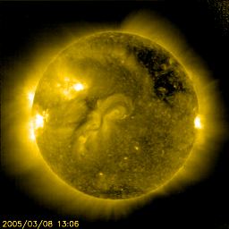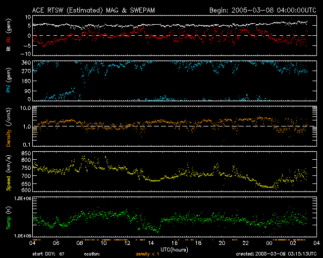 2005/ 3/ 9 12:18 更新 太陽風は高速で(700km/秒)、オーロラ活動も続いています。放射線帯高エネルギー電子密度が増加しています。 担当 篠原 高速太陽風が続いています。 昨日750km/秒に上がった太陽風は、一時、800km/秒ととても高速な状態に達しました。 その後、やや速度を下げて、現在は700km/秒付近で変化しています。 太陽風磁場も強度は5nTと通常レベルですが、南向き成分が頻繁に現れています。 南向き磁場の大きさそのものはそれほど大きくありませんが(-3nT程度)、 速度が高速ですのでオーロラ活動を活発に発生させています。 オーロラの活動度を示しているAE指数のグラフを見ると、 500〜1000nT規模の活動が連続的に観測されています。 激しい活動ではありませんが、活発にオーロラが続いている様です。 地球は高速太陽風領域のまっただ中にいます。 高速風は今日を含めて3日ほど続きそうです。 前周期の変化を参考にすると、太陽風磁場はこれから次第に弱まって行きそうです。 南向き磁場の強度も弱まる事になるので、オーロラ活動は穏やかになっていくでしょう。 放射線帯の高エネルギー電子の密度が一層増加しています。 GOES10,12の両衛星で警戒レベルに達しています。 今後、1週間近く警戒状態が続く可能性もあります。 太陽では、小さいながらも黒点群が増えて来ています。 ここに見えている黒点群の活動は穏やかですが、 東側に上りつつある群が久しぶりにCクラスの小規模フレアを起こした様です。 やがて姿を見せるでしょう。 SOHO衛星のEIT284カメラの映像 (c) SOHO (ESA & NASA)