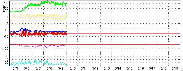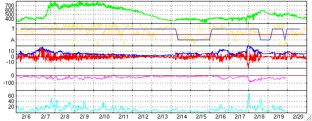 ACEが観測した太陽風の磁場(1番上の枠、白線は全体の強度、赤線は南北成分) および、太陽風の密度(3番目の橙線)、速度(4番目の黄線) (c) NOAA/SEC ![]() リアルタイムAE指数 下段のAEグラフの値が高くなると、オーロラ活動が活発化しています。 (c) 京都大学, NICT ![]() 27日の太陽周期に合わせたデータプロット (太陽風版) 太陽が同じ面を地球に向けていた27日前の変化から、今後を予想することができます。 (c) NICT