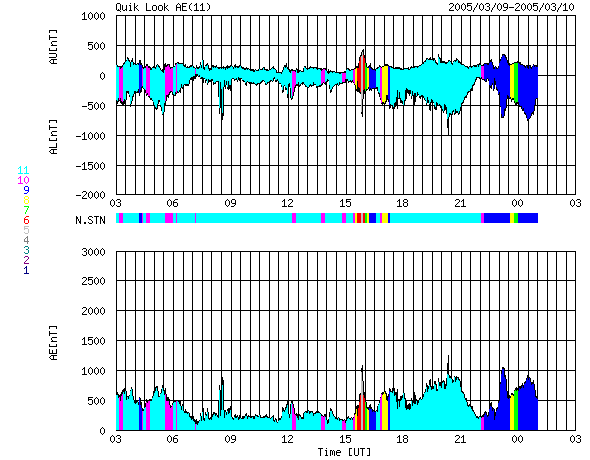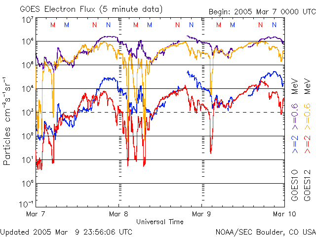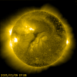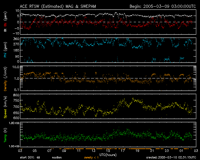 2005/ 3/10 11:34 更新 太陽風は高速状態が続いています(700km/秒)。オーロラも活動的な状態が続いています。 担当 篠原 コロナホールの影響が続いています。 太陽風の速度は650〜750km/秒の間で変化していいて、依然高速です。 SOHO EIT284の太陽画像を見ると、コロナホールはかなり太陽面の西側(右側)に移動しました。 これから次第に影響が弱まって行くでしょう。 27日周期の図を参考にすると、これから緩やかに速度低下が始まり、 2日ほどかけて通常レベルに戻ると予想されます。 太陽風の磁場は強度5nTが続いています。 南向き成分が頻繁に現れているのが今回の擾乱の特徴で、 現在も-3nT程度の南向き磁場が変動しながら常時現れています。 このため、オーロラ活動も活性化されていて、 AE指数で500〜1000nT規模の活動が頻繁に観測されています。 高速風が続いている間は現在規模の活動が続きそうです。今日1日程度ではないでしょうか。 速度が弱まり始めると、同時に磁場強度も弱まって行くと予想され、 オーロラ活動は次第に穏やかになって行くでしょう。 放射線帯の高エネルギー電子は密度が高い状態です。 数値的には、昨日よりもいくらか増加したようです。 太陽面では741黒点群がやや活発化している様です。 昨日のニュースで、久しぶりのCクラスフレアを東端の黒点群が起こしたと記しましたが、 これはデータの読み誤りで、741黒点群が正しい発生箇所でした。 お詫びして訂正致します。 741黒点群は今後も小規模フレアを起こす可能性があります。 SOHO衛星のEIT284カメラの映像 (c) SOHO (ESA & NASA)