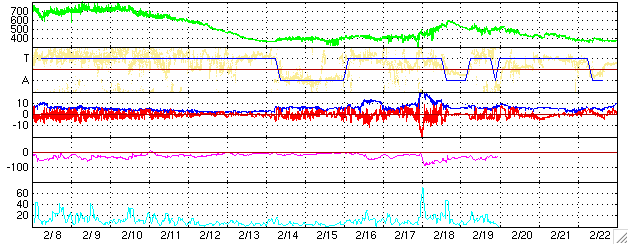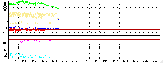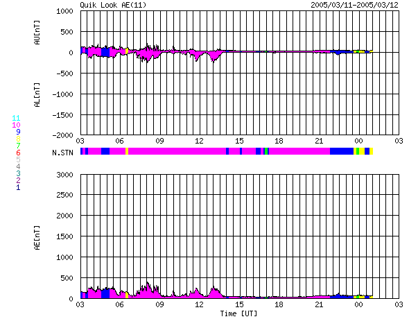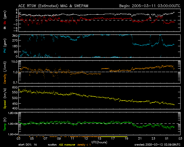 2005/ 3/12 11:13 更新 太陽風速度は通常レベルに戻りました(450km/秒)。セクター境界を迎えている様です。オーロラ活動は静穏です。 担当 篠原 太陽風の速度は順調に低下し、450km/秒と通常レベルに戻っています。 磁場強度は3nT前後、南向き成分もありますが強度は小さく、 速度が低下している事もあり、オーロラ活動は静かになっています。 一方、明日以降と思われていた太陽風磁場のセクター境界が、 一日早くやって来た様です。 ACEの図の2列め、水色の線が上の端から真ん中へ急に変化しています。 これは太陽風磁場の大まかな方向が変化している事を示しています。 まだしばらく様子を見る必要がありますが、 「地球から太陽方向」だった太陽風の磁場が、「太陽から地球方向」に切り替わりつつあります。 この変化自体は地球磁気圏にほとんど影響を与えません。 ただ、切り替わりの前後で太陽風が乱れることがあります。 ACEデータの1列めの最後の部分で磁場が乱れています。 この変化がセクター境界と関連した現象かも知れません。 南向き磁場が現れていますが、太陽風の速度が下がっているので磁気圏活動が大きくなる事はないでしょう。 放射線帯の高エネルギー電子は高いレベルが続いています。 引き続き注意が必要です。 太陽面では741,742,743と3つの黒点群が見えています。 Cクラスの小規模フレアの発生の可能性がある様です。 ACEが観測した太陽風の磁場(1番上の枠、白線は全体の強度、赤線は南北成分) および、太陽風の密度(3番目の橙線)、速度(4番目の黄線) (c) NOAA/SEC ![]() リアルタイムAE指数 下段のAEグラフの値が高くなると、オーロラ活動が活発化しています。 (c) 京都大学, NICT ![]() 27日の太陽周期に合わせたデータプロット (太陽風版) 太陽が同じ面を地球に向けていた27日前の変化から、今後を予想することができます。 (c) NICT