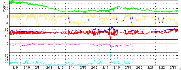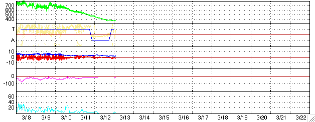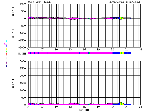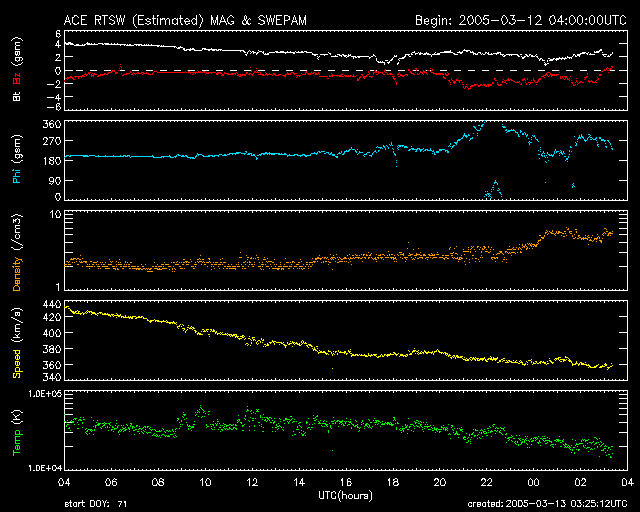 2005/ 3/13 12:29 更新 太陽風は低速になりました(360km/秒)。磁気圏のオーロラ活動は穏やかです。 担当 篠原 太陽風の速度は更に低下して、360km/秒に下がっています。 磁場強度も2nTに弱まり、磁気圏のオーロラ活動はとても穏やかです。 AE指数のグラフでは変化はほとんど見られません。 昨日、太陽風のセクター境界が来ている様だとお伝えしましたが、 はっきりした境界ではなく、中途半端な所で太陽風磁場の方向が変化している様です。 今日これから本当のセクター境界が来て、 太陽風の磁場が「太陽から地球方向」へはっきりと変化するのでしょう。 明日、小規模のコロナホールによって太陽風に小規模の乱れが観測されるかもしれません。 前周期の太陽風の変化でも、セクター境界の変化に伴って磁場が乱れ、 オーロラをやや活発にした(2月16日)経歴があります。 今周期も14〜15日にかけて、小規模の活動にとどまるでしょうが、 オーロラがやや活発になるかもしれません。 放射線帯の高エネルギー電子は密度の高い状態が続いています。 磁気圏が静穏ですので、減少はとてもゆっくりです。 太陽では741黒点群がやや元気な状態です。 小さなCクラス小規模フレアを起こしています。 引き続き、541,742黒点群で小規模フレアの可能性があります。 ACEが観測した太陽風の磁場(1番上の枠、白線は全体の強度、赤線は南北成分) および、太陽風の密度(3番目の橙線)、速度(4番目の黄線) (c) NOAA/SEC ![]() リアルタイムAE指数 下段のAEグラフの値が高くなると、オーロラ活動が活発化しています。 (c) 京都大学, NICT ![]() 27日の太陽周期に合わせたデータプロット (太陽風版) 太陽が同じ面を地球に向けていた27日前の変化から、今後を予想することができます。 (c) NICT