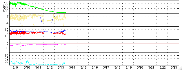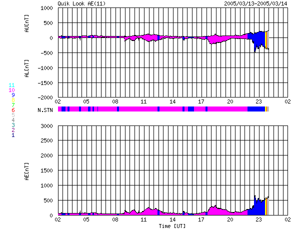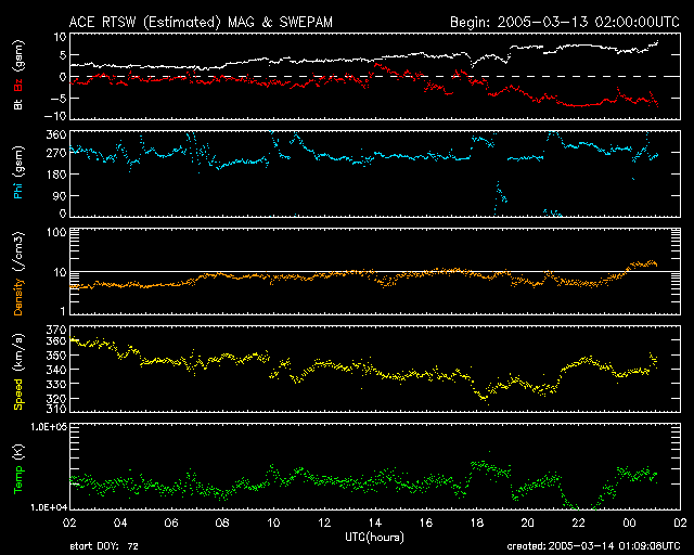 2005/ 3/14 10:13 更新 太陽風磁場の南向きが続いています。速度が遅いので大きな乱れにはなりませんが、磁気圏がやや活動的になるでしょう。 担当 篠原 14日4時(世界時13日19時)頃から、太陽風磁場が連続的に南を向く様になっています。 強度は-5nT程度で普通の大きさです。 太陽風磁場が南を向くと、地球の磁気圏にエネルギーが流れ込み易くなり、 オーロラが活発化したり、磁気嵐が発達したりします。 しかし、今回は太陽風の速度が340km/秒前後と遅いため、 入って来るエネルギーはあまり大きなものになりません。 オーロラの活動度を示す、AE指数のグラフを見ると、500nT前後の変化が観測されています。 オーロラなど磁気圏現象がやや活動的になっている様ですが、これ以上大きな変化にはならないでしょう。 この変化が小規模のコロナホールと関係するものなのか、 セクター境界と関係するものなのかはまだよく分かりません。 磁気圏が大きく乱れる事はないと思われますが、今後の太陽風の変化に注意が必要です。 この太陽風の変化の影響で、放射線帯の高エネルギー電子密度が変化を見せています。 特に、赤線のGOES12のデータに顕著な減少が見られています。 このまま警戒ラインを切るのかどうか、もうしばらく注意が必要です。 太陽面では、741,742の両黒点群が小規模ですが元気に活動しています。 小さなCクラスの小規模フレアですが、それぞれ2回ほど発生させています。 X線画像の動画を見ると、ちかちかと2つの黒点群が輝いている様子が見られます。 ACEが観測した太陽風の磁場(1番上の枠、白線は全体の強度、赤線は南北成分) および、太陽風の密度(3番目の橙線)、速度(4番目の黄線) (c) NOAA/SEC ![]() リアルタイムAE指数 下段のAEグラフの値が高くなると、オーロラ活動が活発化しています。 (c) 京都大学, NICT ![]() 27日の太陽周期に合わせたデータプロット (太陽風版) 太陽が同じ面を地球に向けていた27日前の変化から、今後を予想することができます。 (c) NICT