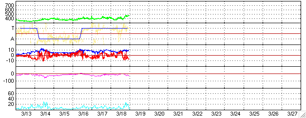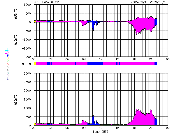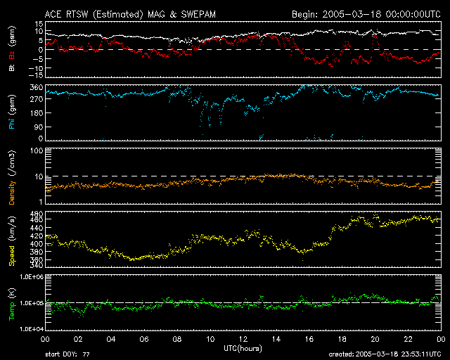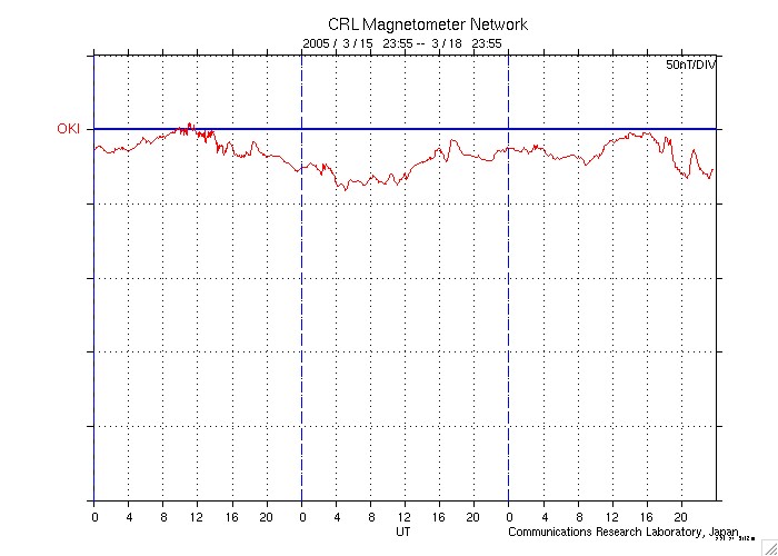 2005/ 3/19 08:56 更新 太陽風磁場が安定して南を向いています。速度は通常レベルですが、磁気圏が活動的になっています。 担当 篠原 太陽風磁場は強度が10nTと強まった状態が続いています。 ACE衛星のデータを見ると、19日0時(18日15時)頃から 磁場の南向き成分(赤線がマイナスになっている)が強まって、 -5〜-10nTの南向きが安定して続いています。 このため、太陽風からエネルギーが効率良く磁気圏に流れ込んでいます。 AE指数を見ると、19日3時(18日18時)頃から500〜1000nT規模の変化が連続して現れています。 極域でオーロラ活動が強まっている様です。 変化の特徴(南向き磁場が安定して継続する)から、磁気嵐的な変化が現れる可能性もあります。 沖縄の磁場データに注目して下さい。 現在、静穏レベル(青横線)から-25nT程度下がっていますが、 この下がりが大きくなると磁気嵐状態が強まっている事を意味します。 今後どの程度まで下がるでしょうか。 ただし、太陽風の速度は450km/秒程度で通常レベルの速度です。 コロナホールなどの高速風要因が見られない(前周期の変化を参照)ことから、 これ以上の大規模な磁気圏擾乱に発達することはないでしょう。 太陽風磁場の南向きが続いている間は、現在の活動度が続きますが、 南向きが終わるとともに静穏に戻って行くと思われます。 太陽黒点は次第に沈み行く742群と、それに続く743群があるだけです。 目立ったフレア活動も無く、静穏な状態です。 ACEが観測した太陽風の磁場(1番上の枠、白線は全体の強度、赤線は南北成分) および、太陽風の密度(3番目の橙線)、速度(4番目の黄線) (c) NOAA/SEC ![]() リアルタイムAE指数 下段のAEグラフの値が高くなると、オーロラ活動が活発化しています。 (c) 京都大学, NICT ![]() 沖縄の磁場擾乱 下へ下がるほど、擾乱が発達している事を意味します。 (c) NICT ![]() 27日の太陽周期に合わせたデータプロット (太陽風版) 太陽が同じ面を地球に向けていた27日前の変化から、今後を予想することができます。 (c) NICT