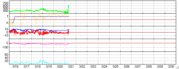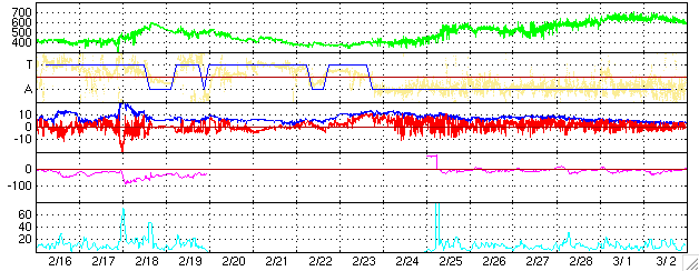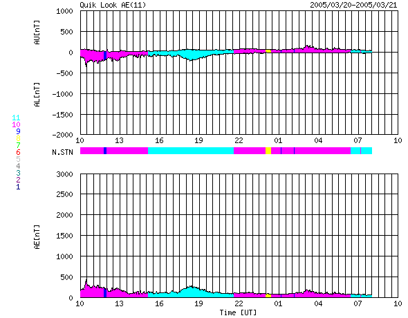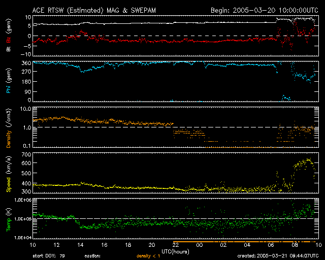 2005/ 3/21 18:49 更新 太陽風の速度が600km/秒と高速になっています。オーロラ活動が活発になる可能性があります。 担当 篠原 NICTのWebサーバが停止していたため、記事の更新が遅くなりました。お詫び致します。 21日17時(世界時21日8時)に太陽風の速度が急に上昇し、400km/秒から600km/秒と高速状態に変化しました。 磁場強度も5nTから8nT程度にやや強まっています。 原因ははっきりしません。CME(太陽ガスの放出現象)を起こしそうな目立ったフレアの発生は無く、 コロナホールも(SOHOの観測が無いために正確には分かりませんが)少し早過ぎる印象です。 太陽風磁場の南北成分は小刻みに変化していて、まだどちら寄りというはっきりした傾向は見えていません。 今後、南向き傾向が強まると、磁気圏が活動的になって、 オーロラが活発になったり磁気嵐が発達する可能性があります。 今後の変化に注意して下さい。 ここまでは、太陽風は速度が350〜400km/秒、磁場強度5nTとともに通常レベルでした。 磁場の南向き成分が-2〜-3nT程度と小さいものの長時間続いていました。 しかし、AE指数のグラフにはほとんど変動は見られず、地球の磁気圏はとても静かでした。 南向きとはいえ値が小さかった事や、速度が通常レベルだったためでしょうか。 太陽風の擾乱原因がはっきりしないため、今後の展開が考えにくくなっています。 前周期の変化を参考にすると、 明後日の23日頃からコロナホールの回帰によって太陽風が乱れると予想されます。 今回の変動がそれに相当する(早まった)のか、今回の変動に重なってコロナホールの変動が見られるのか、 どうなるでしょうか。 太陽面ではまだ番号か記されていませんが、744黒点群がほぼ中心にできています。 小規模な黒点群です。 743黒点群は西に没しつつあります。 Cクラスの小規模フレアを時々発生させていますが、間もなく向こう側に隠れる事になります。 ACEが観測した太陽風の磁場(1番上の枠、白線は全体の強度、赤線は南北成分) および、太陽風の密度(3番目の橙線)、速度(4番目の黄線) (c) NOAA/SEC ![]() リアルタイムAE指数 下段のAEグラフの値が高くなると、オーロラ活動が活発化しています。 (c) 京都大学, NICT ![]() 27日の太陽周期に合わせたデータプロット (太陽風版) 太陽が同じ面を地球に向けていた27日前の変化から、今後を予想することができます。 (c) NICT