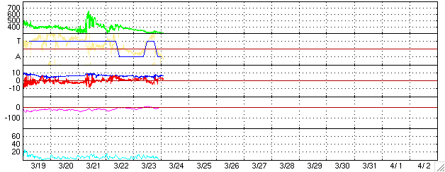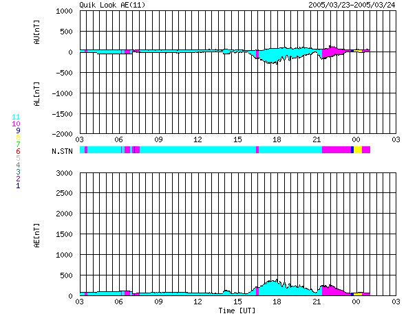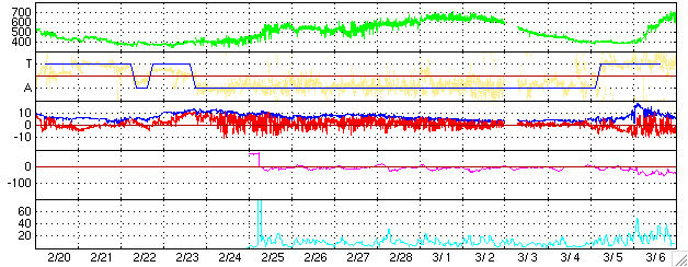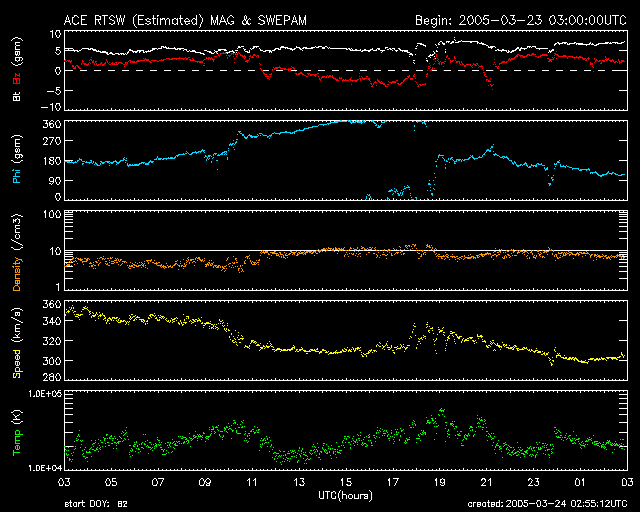 2005/ 3/24 11:59 更新 太陽風の速度は300km/秒と遅くなっています。磁気圏は概ね静穏です。 担当 篠原 ACE衛星の観測によると、太陽風の速度は更に下がって300km/秒とかなり低速度になっています。 前周期のデータから、小規模のコロナホールの影響が見られるのではないかと予想していましたが、 現時点では速度の上昇は見られず、コロナホールの影響は弱まっている様です。 太陽風磁場のデータを見ると、6時間ほど連続して弱い南向きが続いた時間帯があります。 このためAE指数のグラフで300nT程度の弱いオーロラ活動が見られています。 速度が遅い事もあって、小規模の活動に留まったようです。 現在は太陽風磁場は北向きに変わっており、オーロラ活動は穏やかになっています。 これから2日程度は太陽風の様子見というところでしょう。 元々小規模だったコロナホールの影響が全く消えているのか、多少残っているのか、 それによって太陽風の乱れ具合が変わります。 26日頃からは昨日掲載したGOES衛星X線太陽画像に見えていた、 大きなコロナホールの影響が始まるでしょう。 太陽風の速度が上昇し、オーロラ活動が活発になることが予想されます。 太陽のフレア活動は穏やかです。 更に小さい746黒点群が産まれている様です(最新画像がありません)。 ACEが観測した太陽風の磁場(1番上の枠、白線は全体の強度、赤線は南北成分) および、太陽風の密度(3番目の橙線)、速度(4番目の黄線) (c) NOAA/SEC ![]() リアルタイムAE指数 下段のAEグラフの値が高くなると、オーロラ活動が活発化しています。 (c) 京都大学, NICT ![]() 27日の太陽周期に合わせたデータプロット (太陽風版) 太陽が同じ面を地球に向けていた27日前の変化から、今後を予想することができます。 (c) NICT