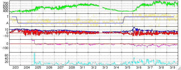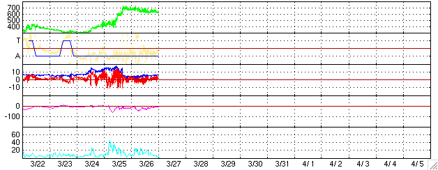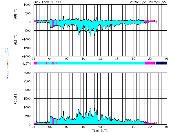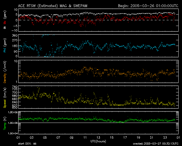 2005/ 3/27 09:35 更新 高速太陽風が続いています(650km/秒)。オーロラも活発に活動しています。 担当 篠原 コロナホールの影響で高速の太陽風が続いています。 昨日より、600〜650km/秒の安定した高速状態が続いています。 太陽風の磁場は強度5nTと普通の強さです。 南北成分(赤線)を見ると、1時間程度の間隔で南北に振れる様な変化が見えています。 このため、オーロラ活動も活発になり、 AE指数を見ると500〜1000nT規模の変動が続いています。 太陽風データの後半部分を見ると、南北成分が北寄りに傾向が変わって来ています。 そのため、オーロラ活動(AE指数)も後半部分は活動度が低下しています。 しかし、太陽風は高速状態が続いていますので、 磁場が再び南寄り傾向に変わった場合には、オーロラ活動も活発に戻るでしょう。 ただし、高速風の後半部分では南北の揺らぎが出にくくなる傾向があります。 27日周期の図を見ると、2月28日から3月1日にかけて太陽風の速度(緑色線)がもう一段上昇しています。 これと同じ傾向がこれから見られるかもしれません。 太陽風磁場強度が5nTから7nTにわずかですが上昇しています。 この変化は今後の速度の上昇を示唆しているのかもしれません。 前周期の速度は最高が700km/秒程度でした。 従って、現在の速度から極端に再上昇するということは無いでしょう。 高速風は3月30日まで続きそうです。 高速風の影響で、放射線帯の高エネルギー電子が増加の傾向を見せています。 まだ警戒レベルには達していませんが、今後の変化に注意して下さい。 太陽のフレア活動は穏やかです。 X線の強度そのものがかなり下がっており、活動的な領域がほとんど見られない事を示しています。 ACEが観測した太陽風の磁場(1番上の枠、白線は全体の強度、赤線は南北成分) および、太陽風の密度(3番目の橙線)、速度(4番目の黄線) (c) NOAA/SEC ![]() リアルタイムAE指数 下段のAEグラフの値が高くなると、オーロラ活動が活発化しています。 (c) 京都大学, NICT ![]() 27日の太陽周期に合わせたデータプロット (太陽風版) 太陽が同じ面を地球に向けていた27日前の変化から、今後を予想することができます。 (c) NICT