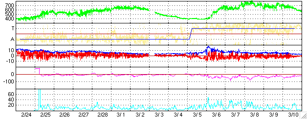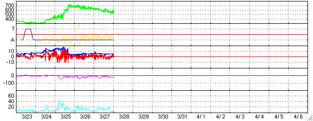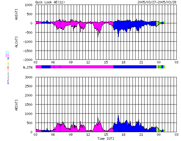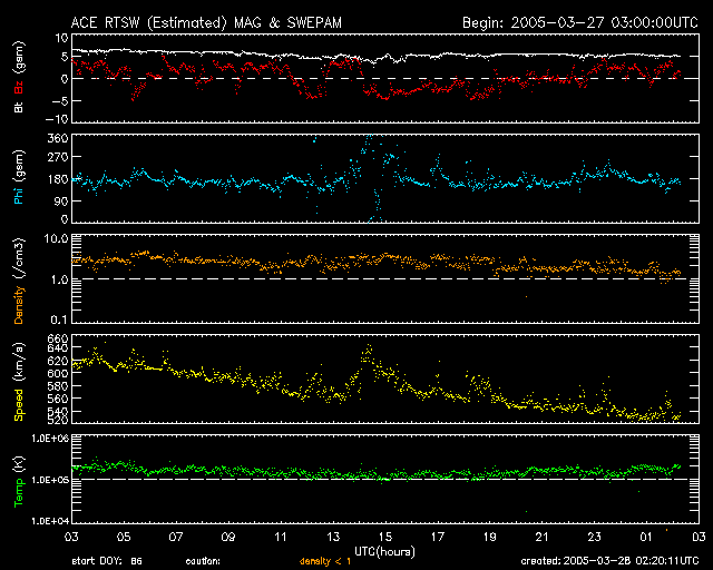 2005/ 3/28 11:25 更新 太陽風の速度は下がり続けています(530km/秒)。オーロラは活発に続いています。 担当 篠原 今日1枚目の写真は、SOHO衛星の太陽カメラが撮影した太陽に近づいて見えている金星です。 金星は明日の29日に外合(ちょうど太陽の反対側に回り込んだ状態をこう呼びます)を迎えるそうです。 SOHOの動画を見ると、金星が太陽のすぐ下を、右から左に移動している様子が良く分かります。 宇宙天気現象ではありませんが、お楽しみ下さい。 太陽面の高速太陽風の吹き出し口の分布がかなり変化しているのでしょうか、 もう一度上がるのではないかと予想した太陽風の速度は、現在も順調に低下を続けています。 昨日の620km/秒程度から、現在は530km/秒まで下がっています。 これは、やや高速という速度です。 27日周期の図を見ると、前周期は3月1〜2日にかけて最も速く700km/秒の速度に達していました。 これは今周期では今日、明日(3月28〜29日)に対応しますが、 今の所、速度がもう一段高くなる気配はありません。 引き続き、もうしばらく注意が必要でしょうが、 このままコロナホールの影響を抜けてしまいそうです。 太陽風磁場の強度は5nTと通常レベルが続いています。 南向き磁場が再び頻繁に現れるようになっています。 このため、オーロラ活動が刺激を受け、 AE指数のグラフでは500nTをやや越える規模の活動が連続的に観測されています。 速度が低下していますので、活動の規模はやや小規模にとどまっている様です。 GOES衛星の観測によると、放射線帯の高エネルギー電子の密度が増加しています。 GOES10衛星では、警戒ラインの10の4乗の線を越えています。 今後GOES12衛星もこのレベルに達すると予想されます。 衛星の運用では障害が発生する可能性が高まりますので、注意が必要です。 太陽面では、小規模の2つの黒点群が見えているだけです。 フレア(太陽爆発)の活動レベルは低く、穏やかな状態が続きそうです。 太陽の右下すぐに見えている明るい星は、外合直前の金星。SOHO衛星LASCO C2カメラが撮影。 (c) SOHO (ESA & NASA) ![]() ACEが観測した太陽風の磁場(1番上の枠、白線は全体の強度、赤線は南北成分) および、太陽風の密度(3番目の橙線)、速度(4番目の黄線) (c) NOAA/SEC ![]() リアルタイムAE指数 下段のAEグラフの値が高くなると、オーロラ活動が活発化しています。 (c) 京都大学, NICT ![]() 27日の太陽周期に合わせたデータプロット (太陽風版) 太陽が同じ面を地球に向けていた27日前の変化から、今後を予想することができます。 (c) NICT