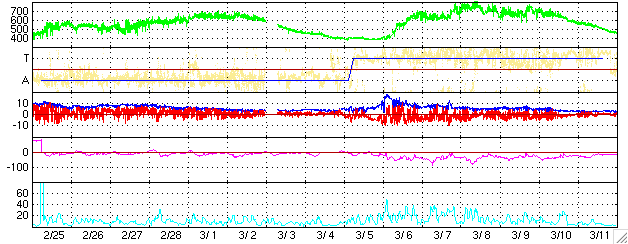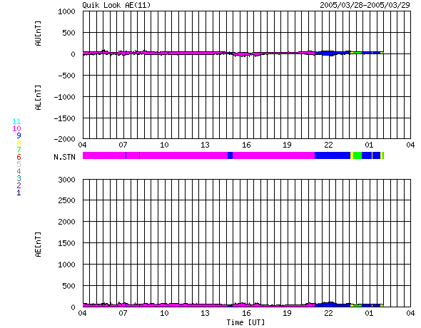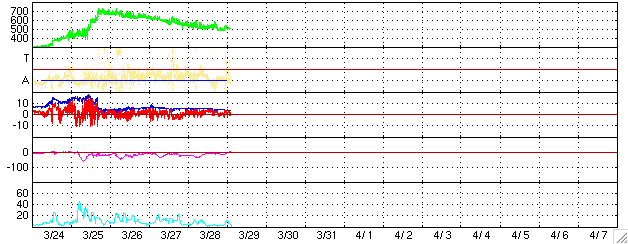 2005/ 3/29 12:01 更新 高速太陽風の領域を抜けつつあります(速度500km/秒)。オーロラ活動はとても穏やかです。 担当 篠原 太陽風の速度は更に緩やかに低下を続けています。 現在は500km/秒と「やや速い」程度にまで下がっています。 磁場強度も5nTから4nTにやや下がっています。 南北成分を見ると(赤線)、北寄りに偏る傾向が強まっています。 このため、地球の磁気圏へのエネルギーの流れ込みがほとんど無くなっている様で、 オーロラ活動を示すAE指数のグラフには全く変化が見られていません。 太陽風の速度はこのまま更に低下して、静穏レベル(400km/秒程度)へ戻って行くでしょう。 SOHO EIT284の観測が依然停止していますので、コロナホールの最新状況が分かりにくくなっていますが、 27日周期の図を参考にすると、これから4日間程度は穏やかな状態が続きそうです。 その後、4月2日頃から、次のコロナホールの影響が始まると予想されます。 前周期の上の図を見ると、3月6日頃から太陽風が大きく乱れているのが分かります。 放射線帯の高エネルギー電子の密度は、昨日以上の増加は見られていません。 青線が警戒レベルに達している程度で、このまま下がって行く可能性が高そうです。 太陽のフレア活動はとても静かです。 黒点群も745の小さな群が1つ、やや西寄りに見えているだけです。 今後も静かな状態が続きそうです。 ACEが観測した太陽風の磁場(1番上の枠、白線は全体の強度、赤線は南北成分) および、太陽風の密度(3番目の橙線)、速度(4番目の黄線) (c) NOAA/SEC ![]() リアルタイムAE指数 下段のAEグラフの値が高くなると、オーロラ活動が活発化しています。 (c) 京都大学, NICT ![]() 27日の太陽周期に合わせたデータプロット (太陽風版) 太陽が同じ面を地球に向けていた27日前の変化から、今後を予想することができます。 (c) NICT