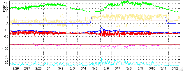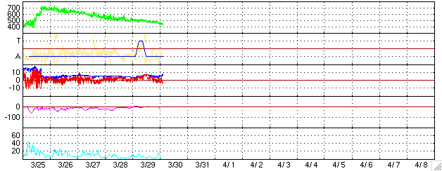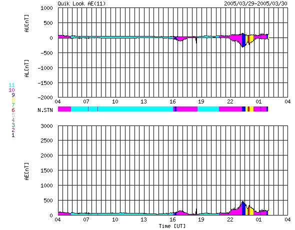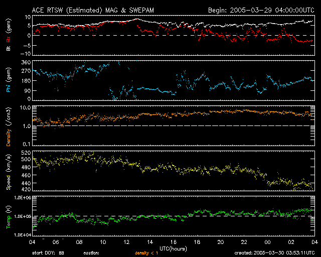 2005/ 3/30 12:58 更新 太陽風は通常の速度に戻っています(440km/秒)。磁気圏も穏やかです。 担当 篠原 太陽風の速度は緩やかに低下を続けています。 現在は440km/秒にまで下がり、通常のレベルに戻りました。 磁場の強度は5nTと、こちらも通常のレベルです。 南北成分は、ここまで北向きが主でしたが、この数時間ほど南向きが見られる様になっています。 このため、AE指数のグラフでも、前半部分は全く変化が見られていませんでしたが、 後半部分で小規模な活動が観測されるようになっています。 磁場の南向き成分は-2〜-3nTと小さなものですし、速度も下がっているので、 今後も小規模なオーロラ活動が見られる程度だと思います。 基本的に、磁気圏活動はもう2日ほどは穏やかな状態が続くでしょう。 4月1日に太陽風磁場のセクター境界が現れ、続いて磁場強度が強まるなどの乱れが起こりそうです。 そして、コロナホールのため2日頃から太陽風の速度が上昇を始めるでしょう。 4月1日頃からオーロラ活動も活発になりそうです。 放射線帯の高エネルギー電子は減少しています。 警戒ラインからは下がりました。 太陽面は西に傾いた小さな黒点群がひとつあるだけで、寂しい様子です。 フレア活動は低調で、X線のグラフにもほとんど変化がありません。 ACEが観測した太陽風の磁場(1番上の枠、白線は全体の強度、赤線は南北成分) および、太陽風の密度(3番目の橙線)、速度(4番目の黄線) (c) NOAA/SEC ![]() リアルタイムAE指数 下段のAEグラフの値が高くなると、オーロラ活動が活発化しています。 (c) 京都大学, NICT ![]() 27日の太陽周期に合わせたデータプロット (太陽風版) 太陽が同じ面を地球に向けていた27日前の変化から、今後を予想することができます。 (c) NICT