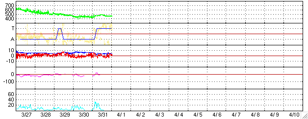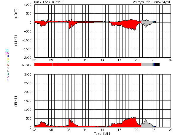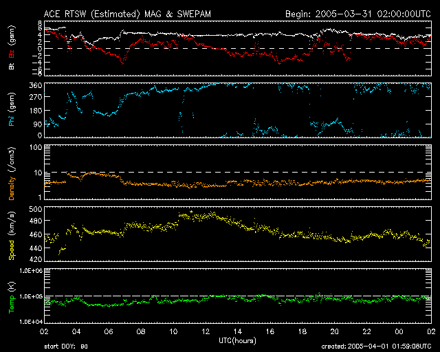 2005/ 4/ 1 11:01 更新 太陽風磁場のセクター境界を越えました。南向き磁場の影響で、オーロラがやや活発になっています。 担当 篠原 前周期より約1日早く、太陽風磁場のセクター境界を越えた様です。 太陽風は太陽から磁場を運ぶという性質があります。 この磁場は大まかに「太陽から地球向き」と「地球から太陽向き」の2つの方向に分類されます。 その方向は太陽の磁場分布によって決まりますが、セクター境界は太陽磁場の分布の境界に対応しています。 セクター境界を越えて、太陽風磁場の方向が切り替わること自体は、 地球磁気圏へ目立った影響を及ぼしません。 しかし、セクター境界を越えると太陽風の様子が変わったり、 コロナホールが近づいて来たりするなどして、太陽風が乱れることがよく起こります。 現在の太陽風は概ね静穏です。 速度は450km/秒、磁場強度は4nTとどちらも通常のレベルです。 南北磁場が緩やかに変化していて、南寄りになる時間帯、北寄りになる時間帯が見られます。 このため、南寄りになった時にオーロラがやや活動的になっています。 AE指数のグラフでは500nT規模のオーロラ活動が度々観測されています。 これからコロナホールの影響で、太陽風磁場が強まり、速度が上昇を始めると予想されます。 セクター境界の到来が1日早まっていますので、コロナホールの影響も早まる可能性があります。 一方、昨日の太陽X線写真ではコロナホールの規模が変化して、影響が遅れそうな印象もあります。 どのように変化が見られるでしょうか。 太陽面では、745黒点群が西に没しつつあります。 写真では、東(左)の端近くに小さな黒点が1つ見えています。 フレア活動はとても穏やかです。 ACEが観測した太陽風の磁場(1番上の枠、白線は全体の強度、赤線は南北成分) および、太陽風の密度(3番目の橙線)、速度(4番目の黄線) (c) NOAA/SEC ![]() リアルタイムAE指数 下段のAEグラフの値が高くなると、オーロラ活動が活発化しています。 (c) 京都大学, NICT ![]() 27日の太陽周期に合わせたデータプロット (太陽風版) 太陽が同じ面を地球に向けていた27日前の変化から、今後を予想することができます。 (c) NICT