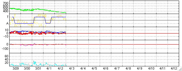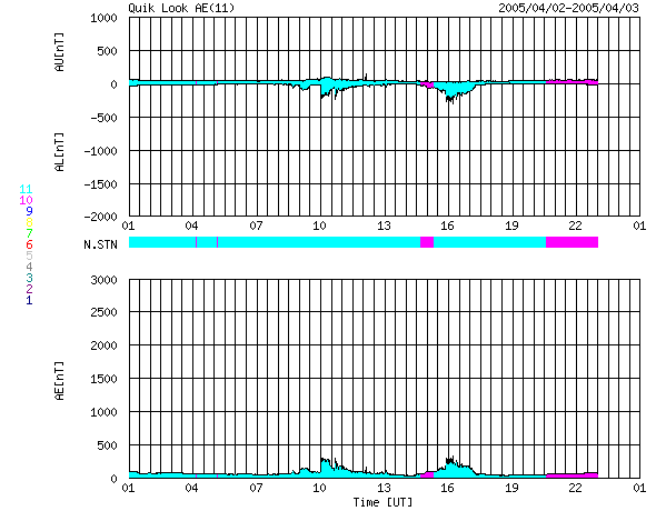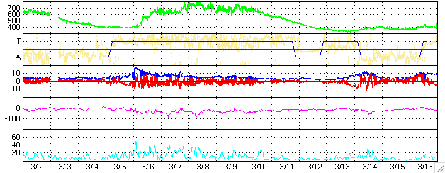ACEが観測した太陽風の磁場(1番上の枠、白線は全体の強度、赤線は南北成分) および、太陽風の密度(3番目の橙線)、速度(4番目の黄線) (c) NOAA/SEC ![]() リアルタイムAE指数 下段のAEグラフの値が高くなると、オーロラ活動が活発化しています。 (c) 京都大学, NICT ![]() 27日の太陽周期に合わせたデータプロット (太陽風版) 太陽が同じ面を地球に向けていた27日前の変化から、今後を予想することができます。 (c) NICT