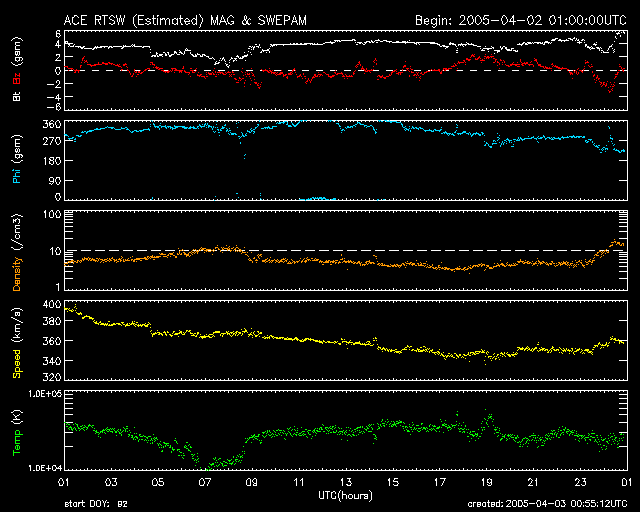2005/ 4/ 3 10:00 更新 太陽風は低速です(350km/秒)。磁気圏は穏やかです。これから明日にかけてコロナホールの影響が始まるでしょう。 担当 篠原 太陽風は緩やかに速度を下げ続け、現在は速度350km/秒と低速です。 磁場強度は5nT程度と通常のレベルが続いています。 このため、地球の磁気圏は静穏です。 オーロラ活動は、2回ほど小規模な活動が起きた程度です(AE指数のグラフ)。 SOHO EIT284の太陽写真の上半分にコロナホールが見えています(暗くなっている領域です)。 ここから吹き出している高速太陽風の影響が、今日から明日にかけて地球に及び始めると思われます。 その前に太陽風磁場の強まりがACE衛星で観測されると予想されます。 27日周期の図をご覧下さい。 この図で、上段の前周期の変化を見ると、3月6日に太陽風の速度上昇が始まっていますが、 この半日ほど前から太陽風磁場の強度が増加を始めています。 これと同様の変化が今回も期待されます。 27日周期で考えると、太陽風速度の上昇は4月2日に既に始まっていなければならないように思われます。 しかし、現在まだ太陽風に乱れは発生していません。 この時間の遅れは、コロナホールの範囲が変化したことによります。 27日前と比べて、現在のコロナホールの領域は半減しているようです。 このため、高速風の開始が後れているのでしょう。 規模が縮小していることから、 高速風の継続期間が短くなったり、最大速度も低くなる可能性があります。 磁場強度が強まって太陽風の速度が上昇する頃に、オーロラが活発になる傾向があります。 南向き磁場が強まると、小規模の磁気嵐状態になる可能性もあります。 これからの太陽風の変化に注意して下さい。 太陽のフレア活動はとても穏やかです。 黒点群も小さいものが見られるだけで、活発な領域はありません。 SOHO衛星のEIT284カメラの映像 (c) SOHO (ESA & NASA)