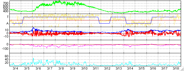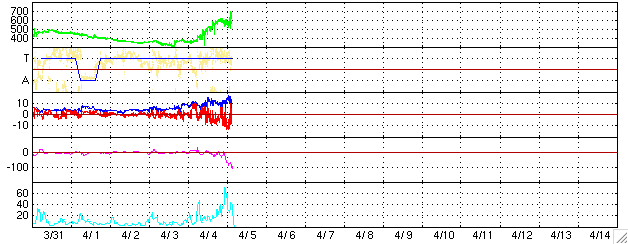 ACEが観測した太陽風の磁場(1番上の枠、白線は全体の強度、赤線は南北成分) および、太陽風の密度(3番目の橙線)、速度(4番目の黄線) (c) NOAA/SEC ![]() リアルタイムAE指数 下段のAEグラフの値が高くなると、オーロラ活動が活発化しています。 (c) 京都大学, NICT ![]() 沖縄の磁場擾乱 下へ下がるほど、擾乱が発達している事を意味します。 (c) NICT ![]() 27日の太陽周期に合わせたデータプロット (太陽風版) 太陽が同じ面を地球に向けていた27日前の変化から、今後を予想することができます。 (c) NICT