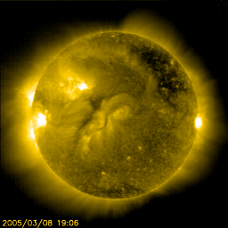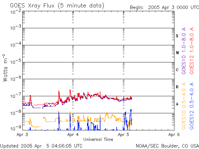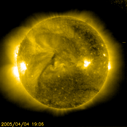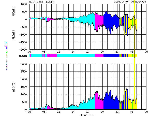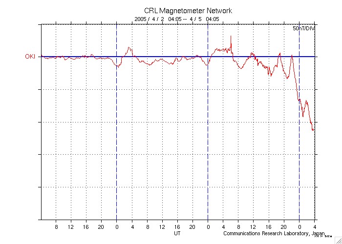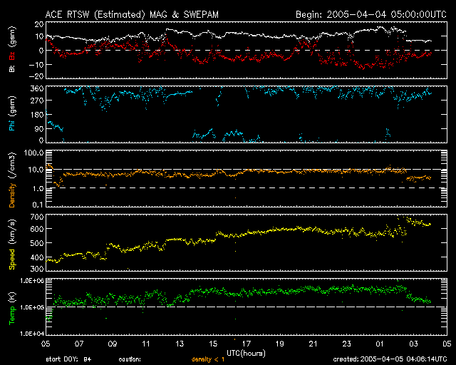 2005/ 4/ 5 13:06 更新 太陽風擾乱が始まりました。南向き磁場が強く、オーロラ活動がとても活発です。磁気嵐も始まっています。 担当 篠原 コロナホールによる太陽風の乱れが本格的になっています。 速度は昨日より上昇を続けており、現在650km/秒に達しています。 磁場強度は再び強まって、10nT前後で推移しています。 これらの数値は、高速太陽風領域としてはさほど大きな変化ではありませんが、 太陽風磁場の南向き成分が-5〜-10nTと強い値で、 4日22時(世界時4日13時)頃から半日程続いており、この影響で磁気圏が大きく乱れています。 オーロラ活動を示すAE指数のグラフでは、1000nTを越える大きな変化が連続的に観測されています。 沖縄の磁場強度は青の横線で示している静穏レベルから大きく下がり、 現在は-100nTにまで下がっています。 これは磁気圏が磁気嵐状態に入っている事を示していると思われます。 磁気嵐が発達する程、沖縄の磁場強度は下がって行きます。 昨日のニュースでは、今回の擾乱は小規模に留まるのではないかと書きましたが、 南向き磁場が長時間続いているために地球への影響が大きく、大きな乱れになっています。 SOHO EIT284の太陽写真を見ると、コロナホールはかなり西に傾いています。 従って、高速太陽風が数日に渡って続く事はないでしょう。 27日前の3月8日の写真と比べると、 コロナホールはより淡く(明るく)なって弱まっており、大きさも小さくなっています。 従って、現在がほぼ最高速で、もう1日程度で速度は低下に転じるのではないでしょうか。 南向き磁場が続いていますので、その間は磁気圏活動は活発に続きます。 南向きから北向きに傾向が変われば、エネルギーの流入が止まるのでオーロラの活動度も低下します。 また、太陽風速度と磁場強度そのものが下がれば、オーロラの規模は小さくなっていきます。 太陽のフレア活動は現在も静穏です。 やや強まっていたX線の背景レベルは、また弱まっています。 黒点群は3つ見えていますが、どれも活動度は低く穏やかです。 SOHO衛星のEIT284カメラの映像 (c) SOHO (ESA & NASA)