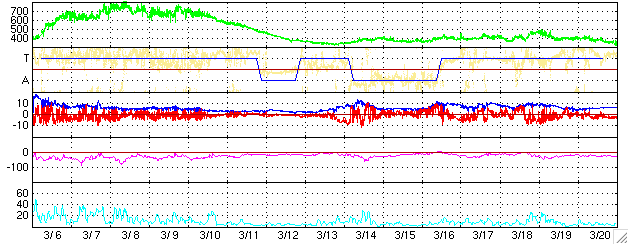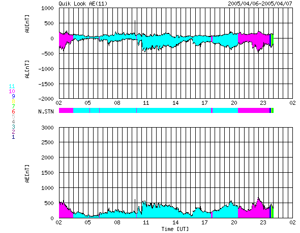 ACEが観測した太陽風の磁場(1番上の枠、白線は全体の強度、赤線は南北成分) および、太陽風の密度(3番目の橙線)、速度(4番目の黄線) (c) NOAA/SEC ![]() リアルタイムAE指数 下段のAEグラフの値が高くなると、オーロラ活動が活発化しています。 (c) 京都大学, NICT ![]() 27日の太陽周期に合わせたデータプロット (太陽風版) 太陽が同じ面を地球に向けていた27日前の変化から、今後を予想することができます。 (c) NICT