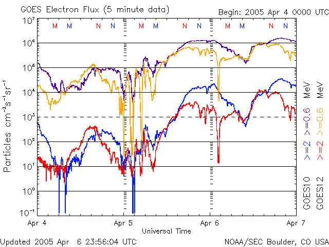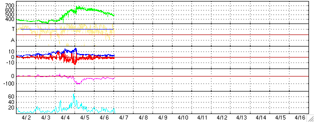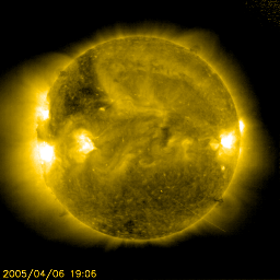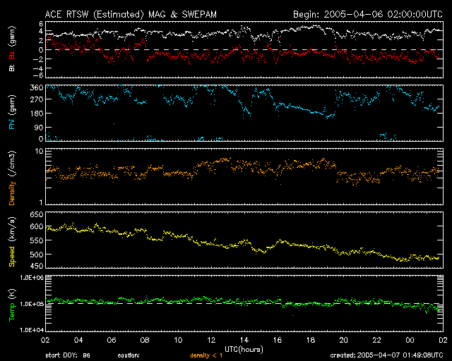 2005/ 4/ 7 10:51 更新 500km/秒まで太陽風速度は下がっています。今日いっぱいで通常レベルに戻るでしょう。オーロラはやや活発に活動を続けています。 担当 篠原 コロナホールの影響は次第に弱っています。 太陽風の速度は500km/秒を切るまで下がりました。 太陽風磁場は強度は3nTとやや弱くなっていますが、南向き成分が昨日から引き続き連続的に見られています。 ACEデータの赤線を見ると、-2nT程度と強さは小さいのですが、南向きが続いています。 このため、磁気圏にも小規模ながら連続的にエネルギーが流入している様です。 AE指数のグラフを見ると、500nT前後の比較的小規模な活動ですが、連続的に観測されています。 太陽風の速度は今後も緩やかに低下を続けるでしょう。 明日には通常レベルに戻っていると思われます。 オーロラ活動は、太陽風磁場の南向き成分がスイッチになっています。 現在の様に南向き傾向が続くと、小規模(速度と磁場強度が下がっているため)ながらオーロラ活動が続くでしょう。 北向き傾向に変わると、オーロラ活動は見られなくなります。 SOHO EIT284カメラの太陽画像を見ると、北東(左上)に新たなコロナホールが見えています。 これは前周期にもありましたが、その時の写真よりもやや濃く見えています。 コロナホールの位置がやや北に寄っていることもあり、前周期はほとんど影響が見られませんでした。 しかし、今回は色がやや濃くなって、勢力も増しているようです。 前周期と変わって、地球へ影響が及ぶかもしれません。 それは、5日後の4月12日頃になると思われます。 放射線帯の高エネルギー電子が増加しています。 赤線と青線のGOES10,12の両衛星で警戒ライン(10の4乗の線)を越えています。 数日間続くと思われますので、衛星の運用ではしばらく注意が必要でしょう。 太陽黒点は小さいものばかりですが、群の数が増えてにぎやかになっています。 一番西(右)の747黒点群が小さなCクラスの小規模フレアを起こしています。 東(左)から上って来た750黒点群は今の所活動は見られていません。 今後も、穏やかな状態が続きそうです。 SOHO衛星のEIT284カメラの映像 (c) SOHO (ESA & NASA)