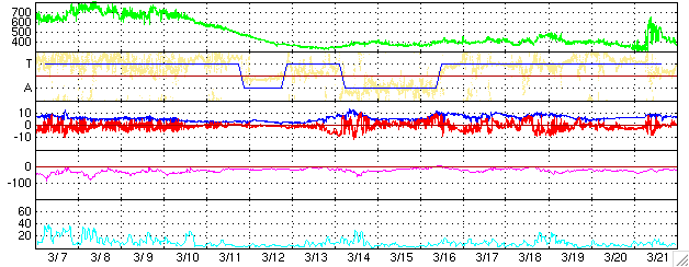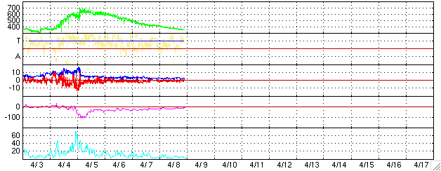 ACEが観測した太陽風の磁場(1番上の枠、白線は全体の強度、赤線は南北成分) および、太陽風の密度(3番目の橙線)、速度(4番目の黄線) (c) NOAA/SEC ![]() リアルタイムAE指数 下段のAEグラフの値が高くなると、オーロラ活動が活発化しています。 (c) 京都大学, NICT ![]() 27日の太陽周期に合わせたデータプロット (太陽風版) 太陽が同じ面を地球に向けていた27日前の変化から、今後を予想することができます。 (c) NICT