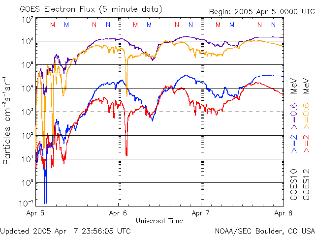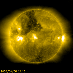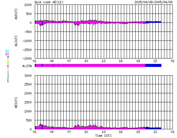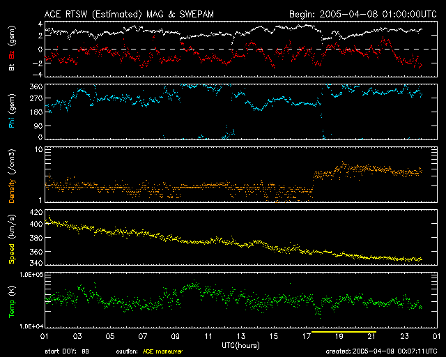 2005/ 4/ 9 09:06 更新 太陽風、地球磁気圏は穏やかです。明日以降、擾乱傾向になる可能性があります。 担当 篠原 太陽風の速度は350km/秒に低下しています。 このため、オーロラ活動はとても低調になっています。 AE指数のグラフにはほとんど変化が観測されていません。 太陽風は今日一日はこのまま穏やかな状態が続くでしょう。 明日以降、太陽風に乱れが発生すると予想されます。 ひとつめは、明日、太陽風磁場のセクター境界に前後して、 太陽風磁場の強度と南北成分が強まる可能性です。 27日周期の図を参考にすると、前周期の3月14日にその変化が見られています。 これと同様の変化が今周期も発生した場合、明日、オーロラ活動が活発になるでしょう。 もうひとつは、明後日頃からコロナホールによる高速太陽風が地球に当たる可能性があります。 SOHO EIT284の太陽写真を見ると、太陽の上半分に黒くコロナホールが広がっているのが見えます。 ちょうど太陽の中心線を越えて、西半球(右半球)側に回り込んでいるところです。 太陽の中心付近にコロナホールがあるときに吹き出した高速の太陽風が、 3日ほどかけて地球へ飛んできます。 コロナホールの端が中心線に達したのが昨日頃ですので、 その最初の高速風が地球に届くのは明後日かその翌日頃になるでしょう。 ちなみに、このコロナホールは前周期はほとんど地球に影響を及ぼしませんでした。 しかし、今周期は規模が大きくなっていますので影響が見られると思います。 放射線帯の高エネルギー電子は密度が高いままです。 衛星運用では引き続き注意が必要でしょう。 次の活発なオーロラ活動が発生すると、一気に減少します。 太陽面では750黒点群が目立っている程度です。 規模は小さく、フレア活動も見られません。 太陽も穏やかな状態が続いています。 SOHO衛星のEIT284カメラの映像 (c) SOHO (ESA & NASA)