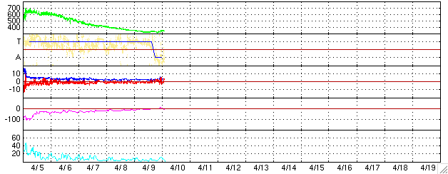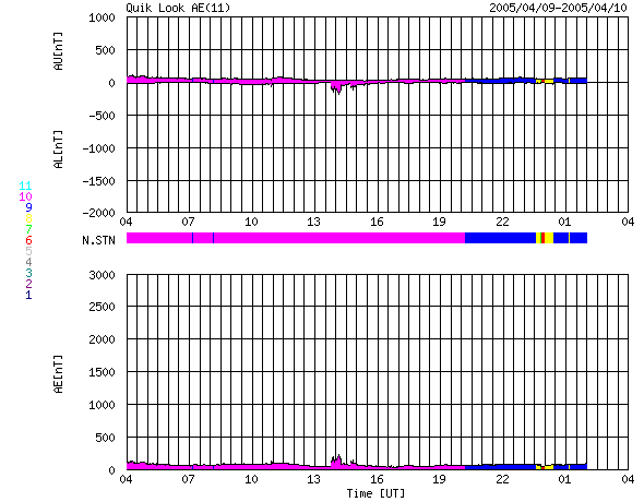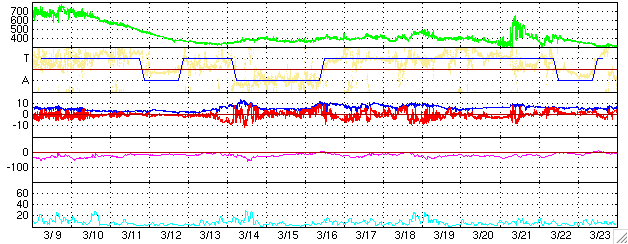 ACEが観測した太陽風の磁場(1番上の枠、白線は全体の強度、赤線は南北成分) および、太陽風の密度(3番目の橙線)、速度(4番目の黄線) (c) NOAA/SEC ![]() リアルタイムAE指数 下段のAEグラフの値が高くなると、オーロラ活動が活発化しています。 (c) 京都大学, NICT ![]() 27日の太陽周期に合わせたデータプロット (太陽風版) 太陽が同じ面を地球に向けていた27日前の変化から、今後を予想することができます。 (c) NICT