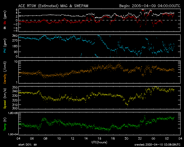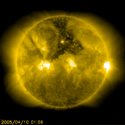 2005/ 4/10 12:14 更新 オーロラ活動など、磁気圏は静穏です。太陽風の乱れがこれから始まるでしょう。 担当 篠原 現在、太陽風の速度は340km/秒と遅く、磁気圏は静穏な状態が続いています。 この数日お知らせして来ましたが、これから太陽風に擾乱が発生すると予想されます。 その初めとして、今日、10日に日が変わった頃に太陽風磁場のセクター境界が来ました。 前周期では、これに前後して太陽風の磁場が乱れ、オーロラ活動が活発化したのですが、 現在は磁場強度が2nTから4nTにわずかに強まっただけで、目立った乱れは発生していません。 これからどうなるのか、もうしばらく注意が必要でしょう。 続いて、明日からはコロナホールの影響が始まると予想されます。 SOHO EIT284の太陽写真をご覧下さい。 コロナホールが太陽の上面に黒く縦に広がっています。 ここから吹き出した高速の太陽風が、明日くらいに地球に到達すると思われます。 こちらは前周期はほとんど影響が無かったのですが、 今回はコロナホールがずいぶんはっきりと見えていますので、影響が見られるでしょう。 速度上昇の後、3日ほど注意が必要です。 また、オーロラ活動などは、速度が上昇している頃により発生しやすい傾向があります。 GOES衛星の観測によると、放射線帯の高エネルギー電子は依然警戒レベルを越えています。 次のオーロラ活動が見られるまでは、引き続き注意が必要です。 太陽面では、西(右)の端に急に751群が現れ、Cクラス以下の小規模な活動を見せています。 更に発達するかもしれませんが、間もなく向こう側に回り込んでしまい、 地球からは見えなくなります。 その他の黒点群は穏やかなままです。 SOHO衛星のEIT284カメラの映像 (c) SOHO (ESA & NASA)