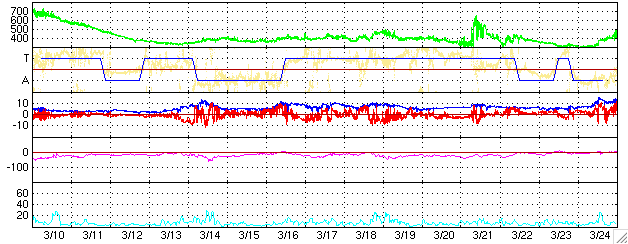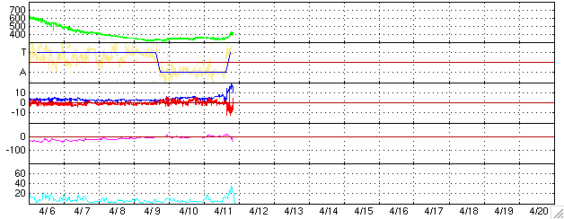 ACEが観測した太陽風の磁場(1番上の枠、白線は全体の強度、赤線は南北成分) および、太陽風の密度(3番目の橙線)、速度(4番目の黄線) (c) NOAA/SEC ![]() リアルタイムAE指数 下段のAEグラフの値が高くなると、オーロラ活動が活発化しています。 (c) 京都大学, NICT ![]() 沖縄の磁場擾乱 下へ下がるほど、擾乱が発達している事を意味します。 (c) NICT ![]() 27日の太陽周期に合わせたデータプロット (太陽風版) 太陽が同じ面を地球に向けていた27日前の変化から、今後を予想することができます。 (c) NICT