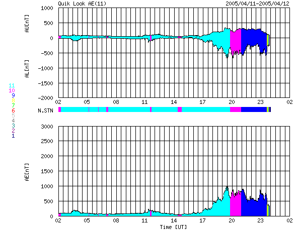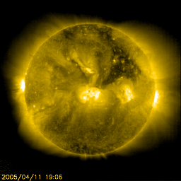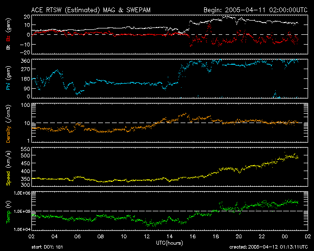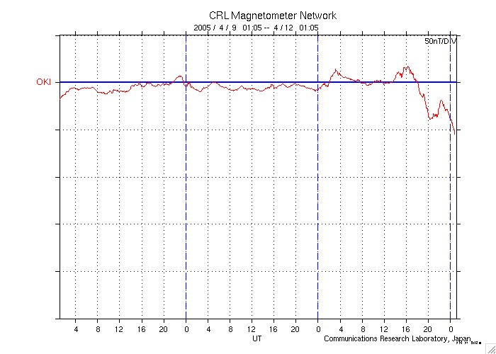 2005/ 4/12 10:19 更新 コロナホールの影響が始まりました(速度500km/秒)。南向き磁場が強まっており、磁気圏が乱れています。 担当 篠原 12日に日付が変わった頃(世界時11日15時)から、太陽風の様子に変化が始まりました。 太陽風の速度が350km/秒から次第に上昇を始め、現在は500km/秒に達しています。 まだ上昇を続けそうです。 また、太陽風磁場の強度が急増し、10〜20nTに強まっています(現在は10nT)。 特に注目されるのが南向き磁場で、-5〜-10nTの強い南向きが連続的に現れています。 このため、磁気圏にエネルギーが流れ込み、オーロラなどの活動を強めています。 AE指数のグラフでは、500〜1000nT規模の活発なオーロラ活動が捉えられています。 太陽風の速度がまだ上昇しきっていないため、激しい活動には発展していませんが、 今後、更に速度が上昇し、磁場の南向き傾向も続くと、一段と大きな活動になる可能性もあります。 変化は沖縄の磁場データにも見られています。 沖縄の磁場強度が-50nTの減少を示しています。 弱い磁気嵐状態に発達しつつある様です(下へ下がるほど、磁気嵐の発達を示します)。 今後の変化に注目して下さい。 SOHO EIT284の太陽写真では、コロナホールは地球へ影響を及ぼす位置に来ています(見かけの位置です)。 これから2〜3日程度高速風が続くでしょう。 前周期の実績がありませんので、どの様な変化がこれから見られるのか、注視したいところです。 その後は、再び穏やかな日が続くでしょう。 今回の擾乱の影響を受け、放射線帯の高エネルギー電子は一気に減少しています。 高速風の通過後に再び上昇する可能性があります。 太陽のフレア活動はとても穏やかです。 東西両端で見られていた小規模の活動も、今日は治まっています SOHO衛星のEIT284カメラの映像 (c) SOHO (ESA & NASA)