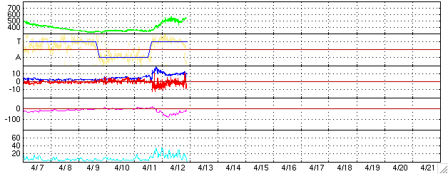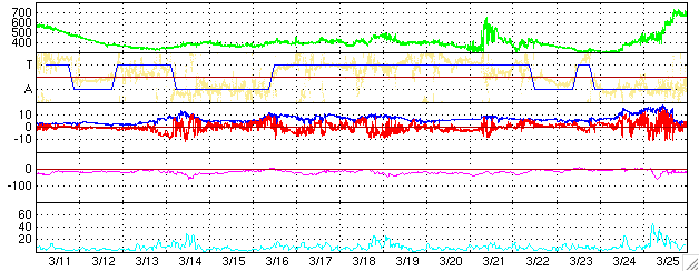 ACEが観測した太陽風の磁場(1番上の枠、白線は全体の強度、赤線は南北成分) および、太陽風の密度(3番目の橙線)、速度(4番目の黄線) (c) NOAA/SEC ![]() リアルタイムAE指数 下段のAEグラフの値が高くなると、オーロラ活動が活発化しています。 (c) 京都大学, NICT ![]() 沖縄の磁場擾乱 下へ下がるほど、擾乱が発達している事を意味します。 (c) NICT ![]() 27日の太陽周期に合わせたデータプロット (太陽風版) 太陽が同じ面を地球に向けていた27日前の変化から、今後を予想することができます。 (c) NICT